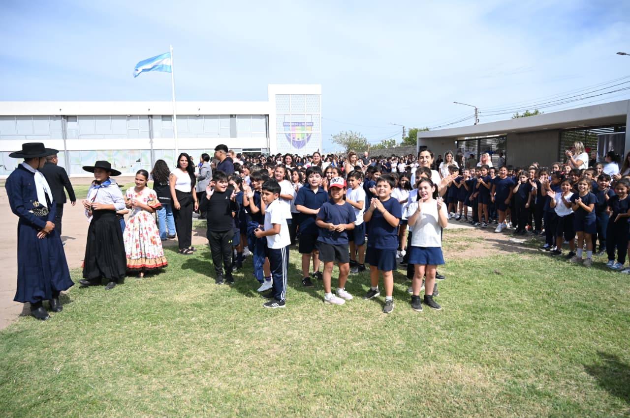 Para conmemorar el empeño de los actores escolares, se llevó a cabo un acto alusivo en el patio del edificio que contó con la participación del gobernador Claudio Poggi, el ministro de Educación, Guillermo Araujo, y funcionarios del gabinete.