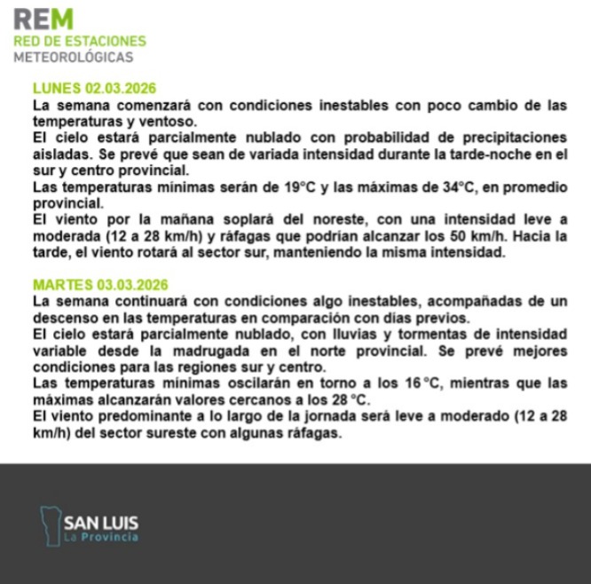 Para este lunes, el cielo estará parcialmente nublado con probabilidad de precipitaciones aisladas. Se prevé que sean de variada intensidad, durante la tarde-noche, en el sur y centro provincial. En promedio provincial, las temperaturas mínimas serán de 19°C y las máximas de 34°C.