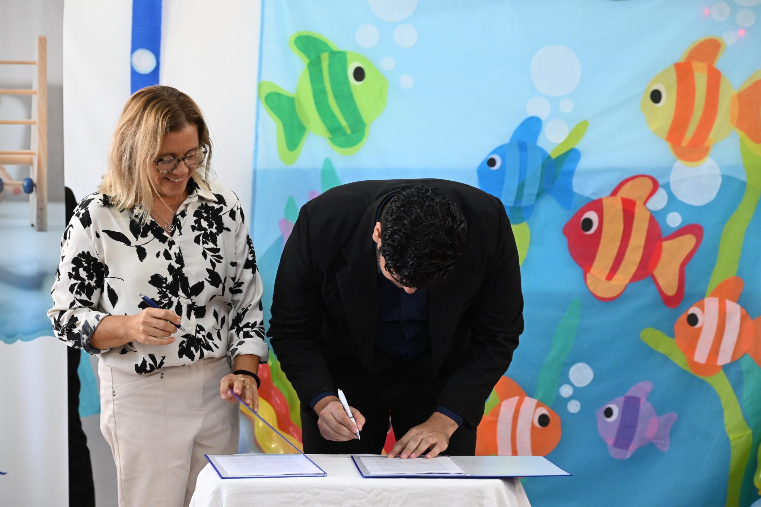 Por su parte, la presidente de la Constructora San Luis SAPEM, María Pía Pollio, expresó: “Hoy vamos a firmar un contrato para una nueva etapa, no nos vamos de la escuela, señor director, vamos a seguir trabajando para la seguridad, el confort térmico de la escuela”.