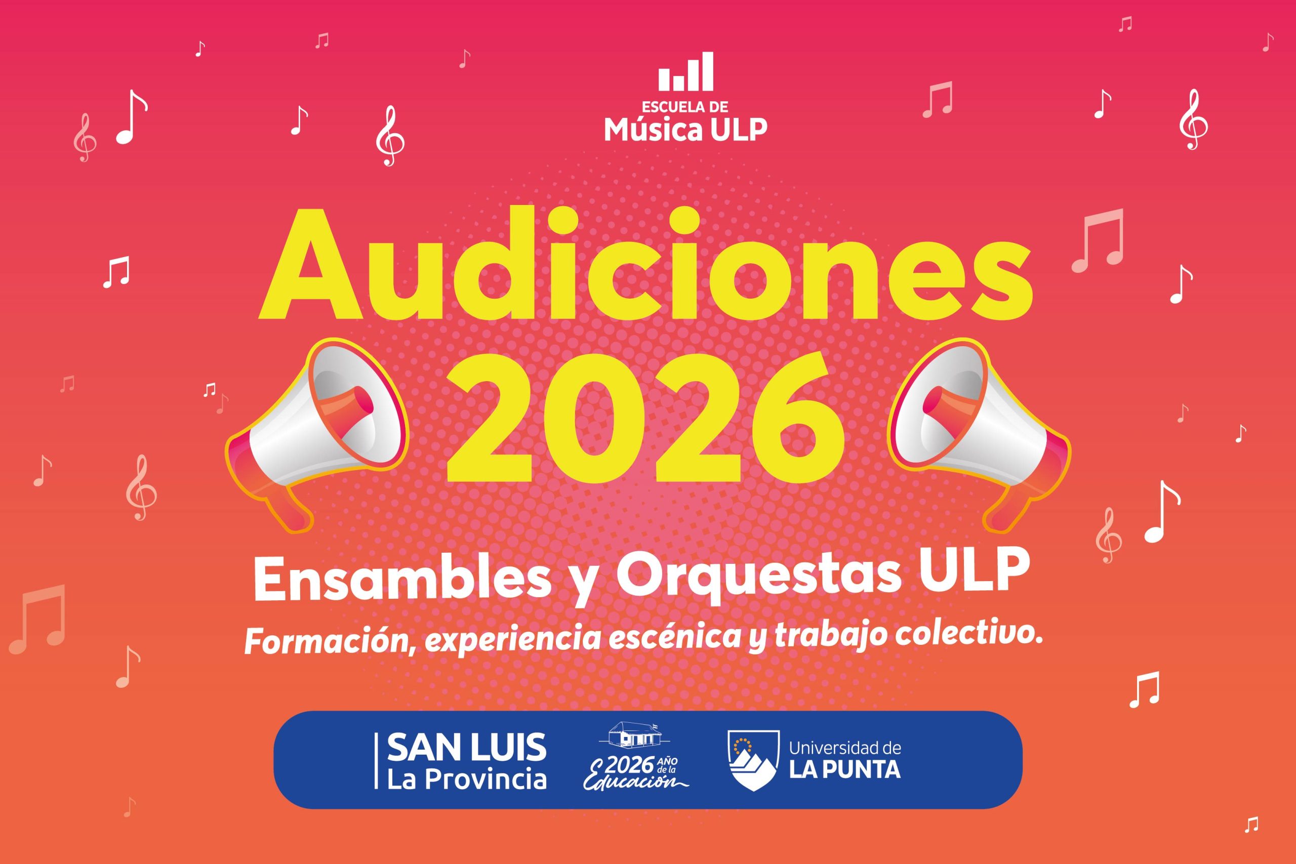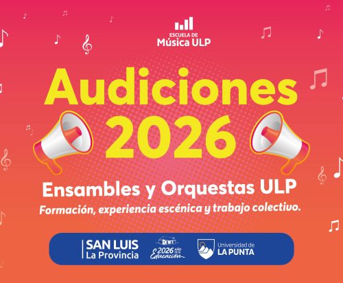 La Universidad de La Punta (ULP) lanzó la convocatoria 2026 para integrar los ensambles y orquestas de la Escuela de Música ULP. Las audiciones para Ensamble de Guitarras Cuyanas, Ensamble Junior, Ensamble de Música Autóctona y Popular de Latinoamérica, Ensamble de Jazz, Orquesta ULP, Ensamble de Cámara y Ensamble de Tango, se realizarán durante la segunda semana de marzo en la Escuela de Música ULP, ubicada en Pringles 1157, en la capital.