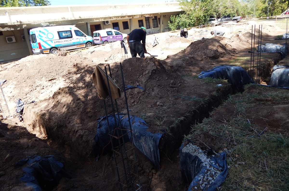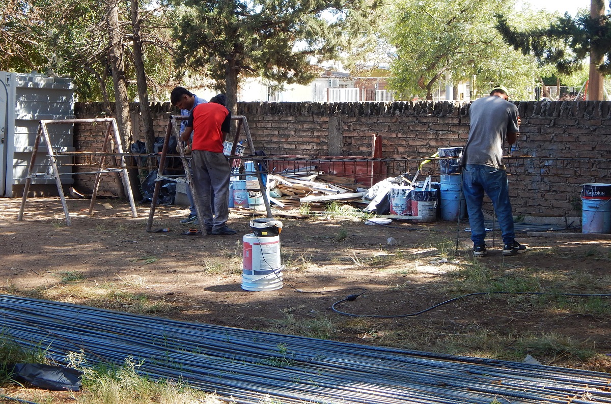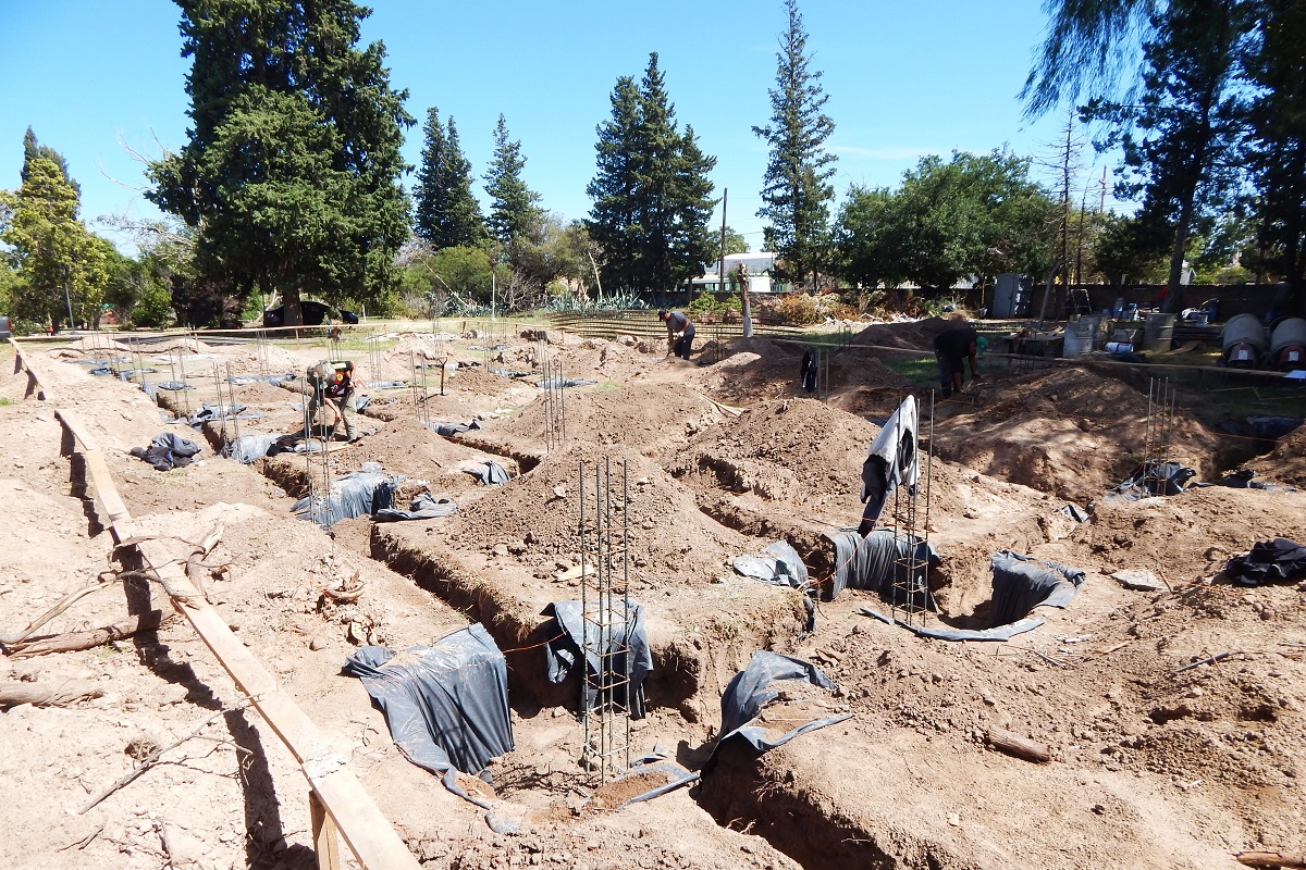 La dirección de Obras de Arquitectura y Viviendas detalló que actualmente los trabajos se concentran en la excavación y el llenado de fundaciones en el sector donde se construirá una nueva aula y un Salón de Usos Múltiples (SUM). En el predio ya se realizó el replanteo completo, delimitado con hilos y tablas perimetrales que marcan con precisión la traza de la construcción. Se ejecutaron múltiples excavaciones para bases aisladas, donde puede observarse el armado de columnas con hierros colocados y alineados, listos para el posterior hormigonado.