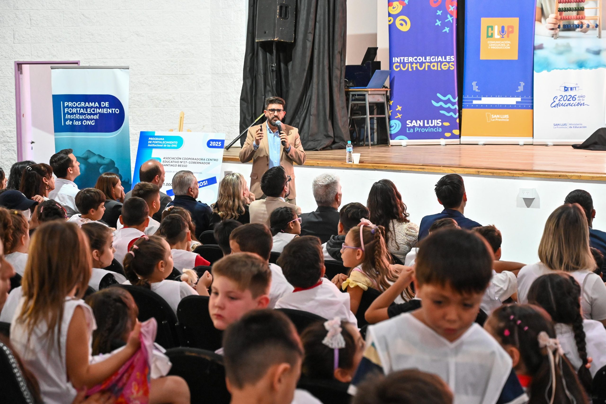 La última parada de la jornada de Gira Educativa tuvo como protagonista al Centro Educativo N°27 ‘Gobernador Santiago Besso’ de la Villa de Merlo, donde el gobernador Claudio Poggi aprovechó para visitar obras de refacción y mantenimiento, reconocer a directivos que accedieron a cargos jerárquicos, premiar a estudiantes que se destacaron en los Juegos Intercolegiales y presentar algunas políticas públicas que impulsa el Estado para el ciclo lectivo 2026, el denominado Año de la Educación por la conmemoración de los 200 años de la fundación de la primera escuela en la provincia.