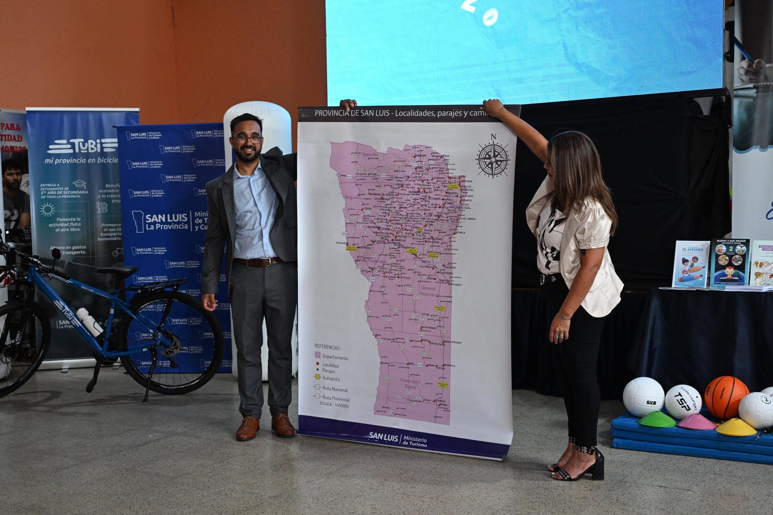 Como broche de oro a la exposición, el ministro Juan Álvarez Pinto le entregó a la directora escolar, Fanny Lacerda, un mapa de la provincia de San Luis para el uso de la escuela.