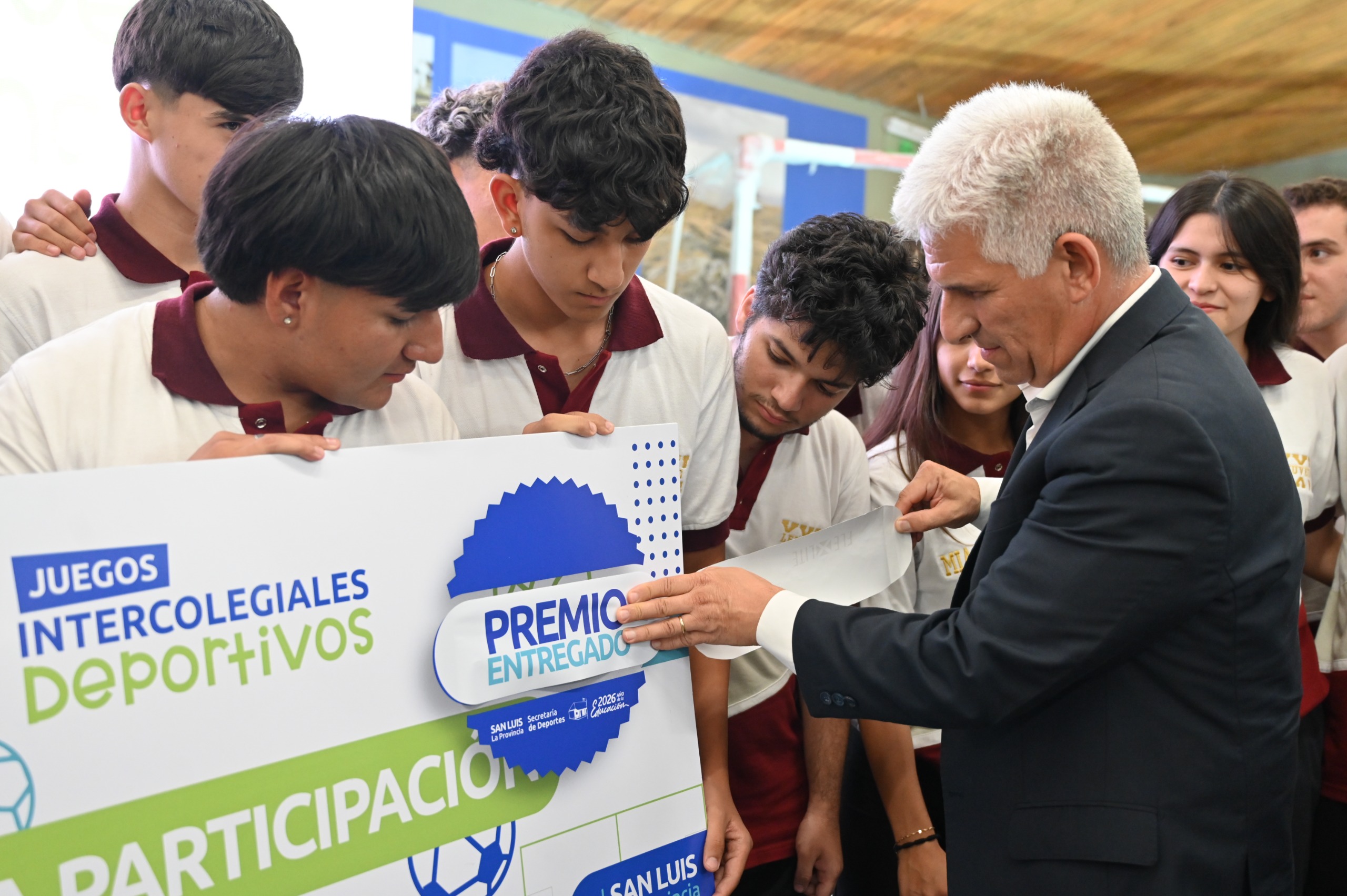 Durante la jornada, se vivió un momento especial y emocionante donde tres escuelas recibieron sus premios por su participación en el certamen. Los cheques simbólicos por $20.000.000 fueron entregados por el gobernador Poggi, el ministro de Educación, Guillermo Araujo, y la secretaria de deportes, Muñiz. Cada institución seleccionó y adquirió los materiales deportivos de acuerdo a las disciplinas que realizan y las instalaciones de la institución.