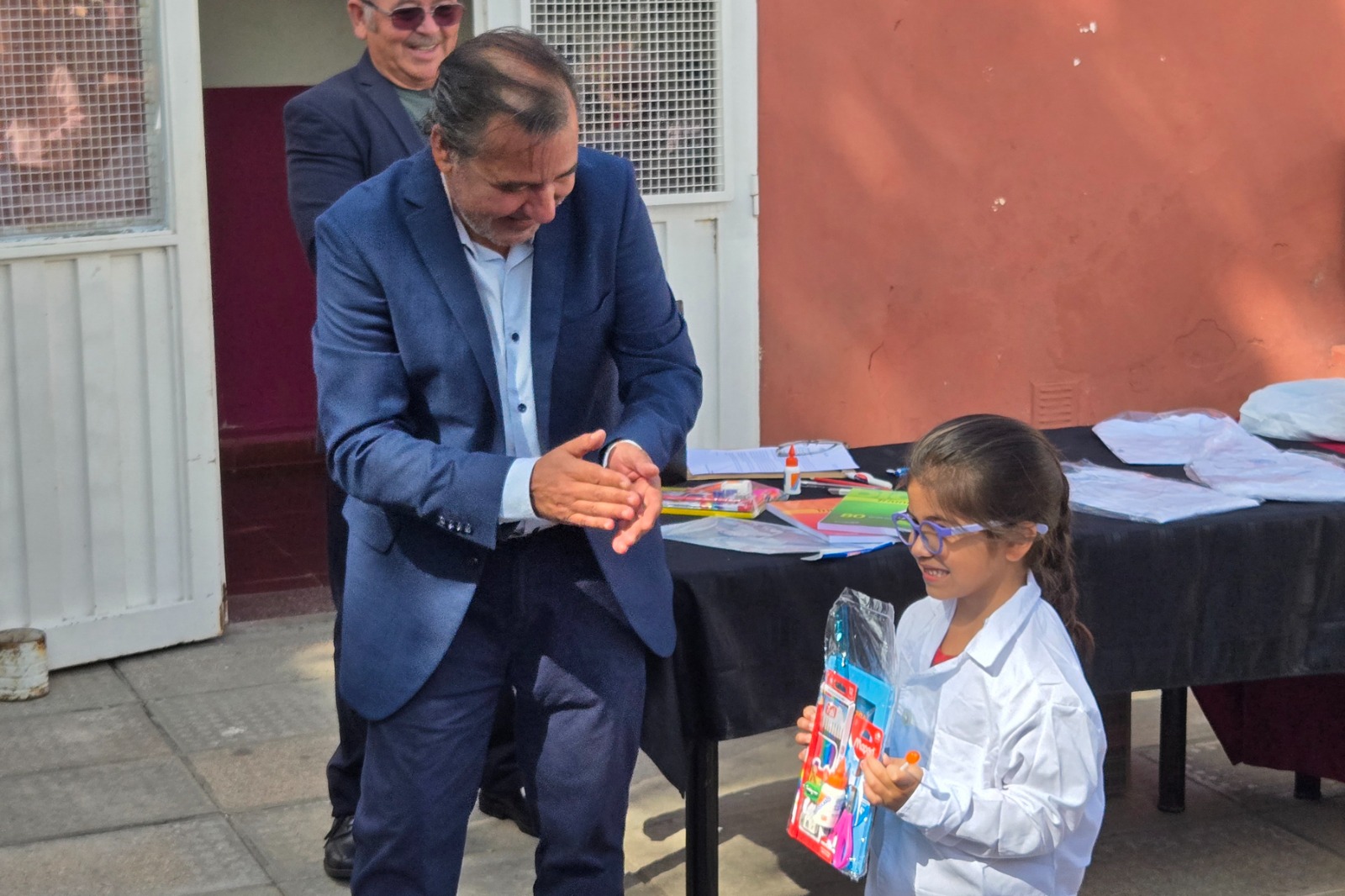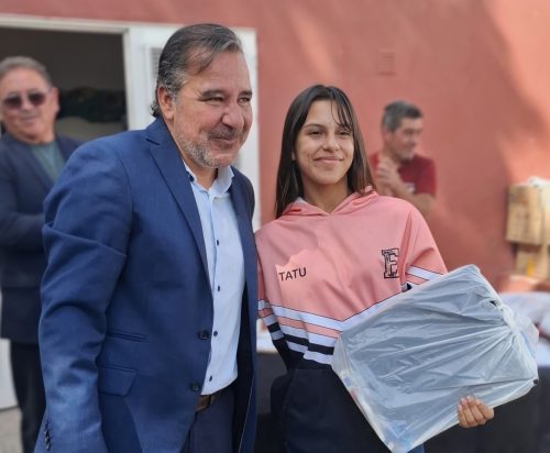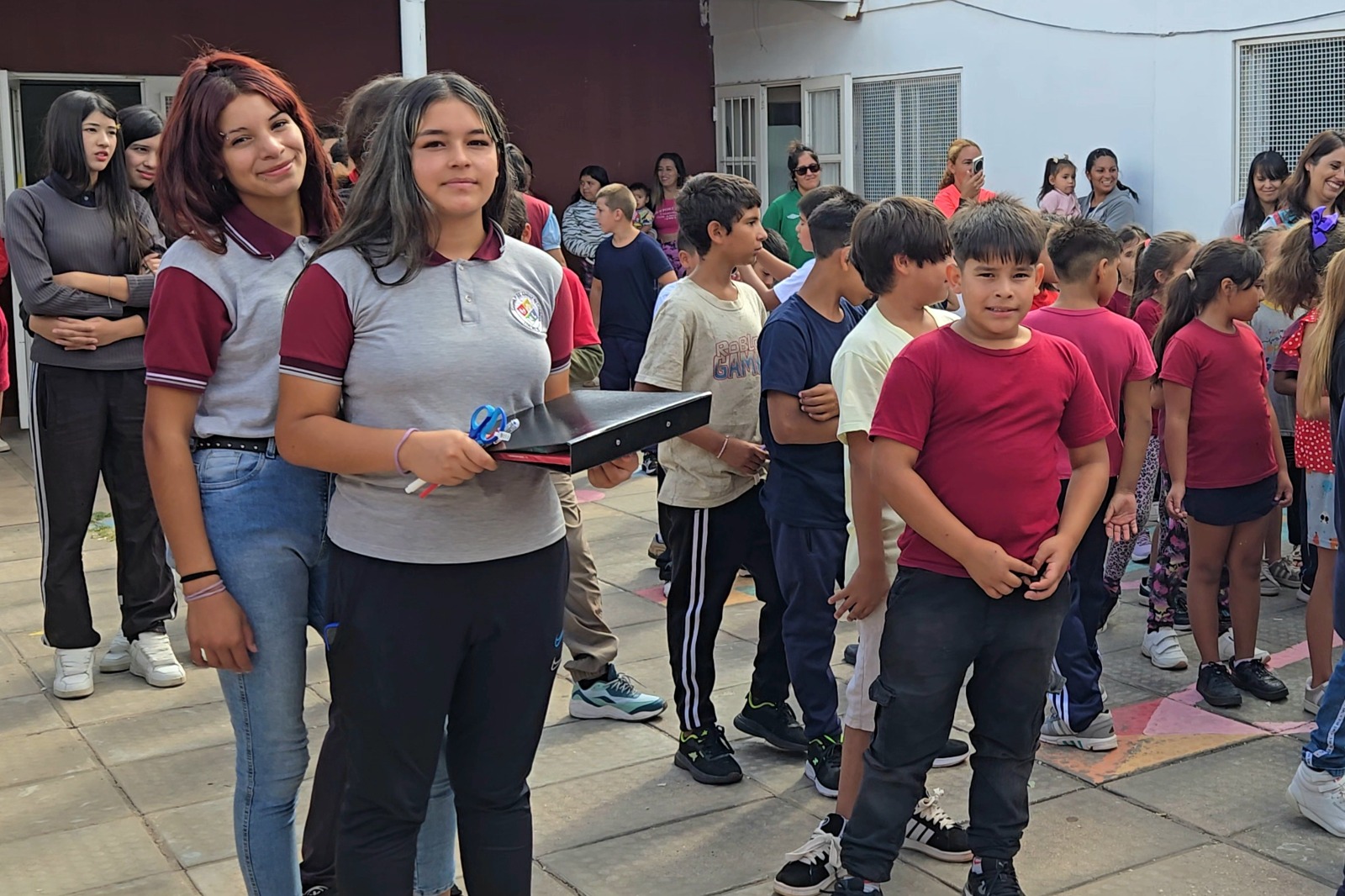 Tras el sonido de la campana, los alumnos del Primario y Secundario formaron en el patio junto a los más pequeños para recibir sus kits. Allí, Giraudo leyó la carta enviada por el Gobernador, quien expresó: “Los invito a abrazar con entusiasmo cada día de aprendizaje. Sepan que cada esfuerzo, cada pregunta y cada curiosidad que exploren será un paso más hacia su futuro. Ustedes son el corazón de nuestra comunidad educativa”.