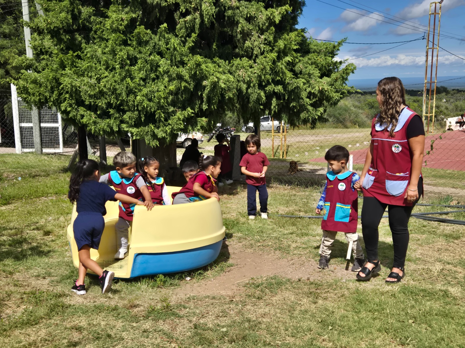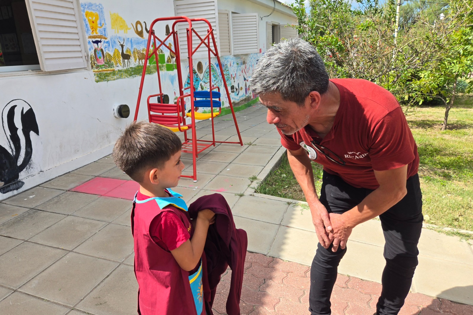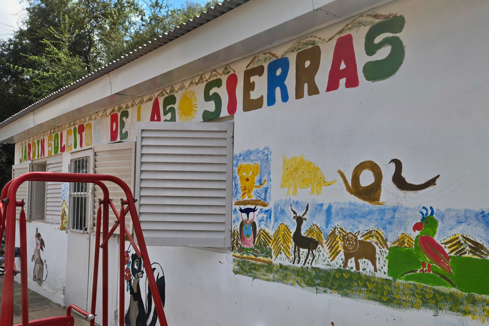 El director, Ricardo Mesina, recibió al equipo junto a los docentes y realizó un recorrido por las aulas, la cocina y las salitas. En el ingreso, un cartel anunciaba ‘2026 Año de la Educación’, acompañado por guirnaldas y mensajes de bienvenida al nuevo ciclo lectivo. El patio interno y el jardín ‘Solcito de las Sierras’ lucían murales coloridos realizados por familias y personal de la institución, con paisajes de San Luis, la ruta 3 y animales autóctonos de la zona.