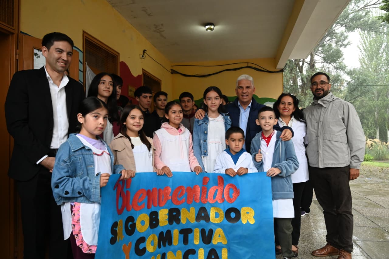 Poggi llegó a la primera parada de su Gira Educativa por el departamento San Martín bajo una copiosa y persistente lluvia. “Es una bendición”, dijo el jefe de Estado. Asimismo, saludó a docentes y alumnos, que lo esperaron con un cartel de bienvenida. Tras dejar un mensaje en el libro de visitas, el Gobernador le habló a la comunidad, que tiene 27 alumnos distribuidos en sus tres niveles, para explicarle la esencia de su gira, recordar el legado de Domingo Faustino Sarmiento, su influencia en la educación argentina y su anhelo de replicar la visión del prócer sobre el país y que San Luis sea una gran escuela.