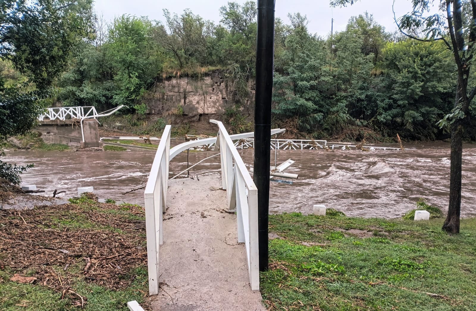 Según datos recabados en la localidad de Las Chacras, se registraron más de 150 milímetros de lluvia, lo que provocó que el río que atraviesa la zona incrementara notablemente su caudal y arrastrara un puente peatonal inaugurado el año pasado.