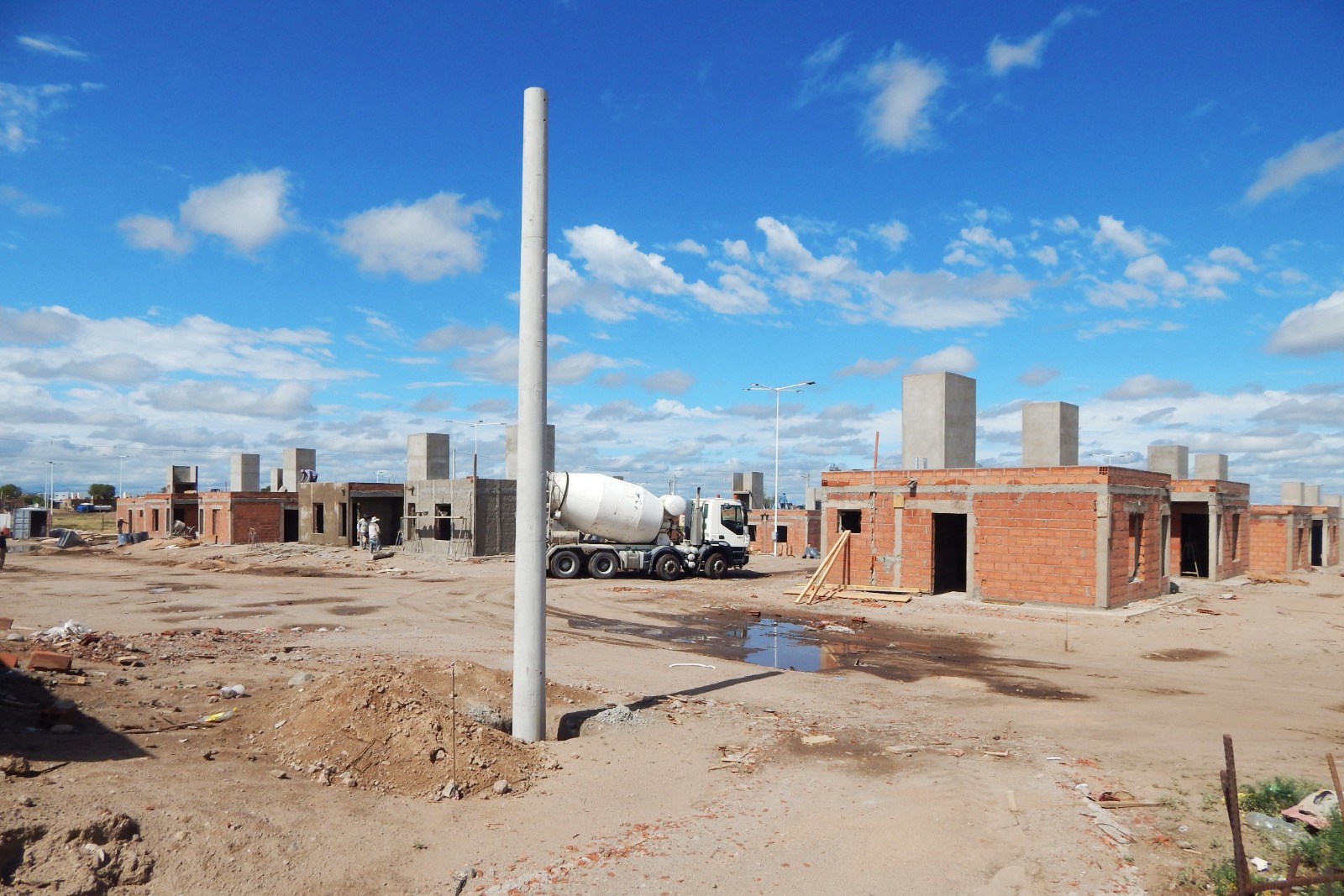 De manera complementaria, también progresa la infraestructura básica del sector, donde ya se distinguen columnas de alumbrado instaladas y pilares de servicios en proceso de ejecución. En conjunto, el desarrollo habitacional consolida su avance estructural y varias unidades comienzan a prepararse para ingresar en la fase de instalaciones y terminaciones, un nuevo paso dentro del proceso de construcción de estas viviendas.