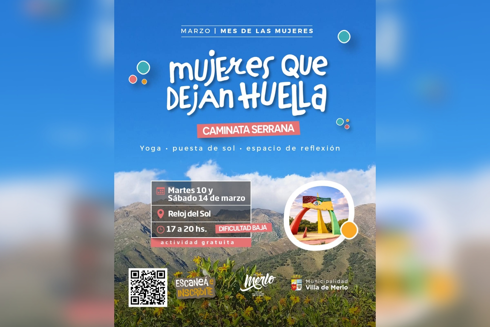 Entre las propuestas innovadoras y especiales por el Mes de las Mujeres, la municipalidad de Merlo organizó ‘Mujeres que dejan huella’, una iniciativa que combina contacto con la naturaleza, actividad física y momentos de encuentro y recreación en las Sierras de los Comechingones. La primera jornada se desarrolló este martes y el próximo encuentro será el sábado 14, de 17:00 a 20:00.