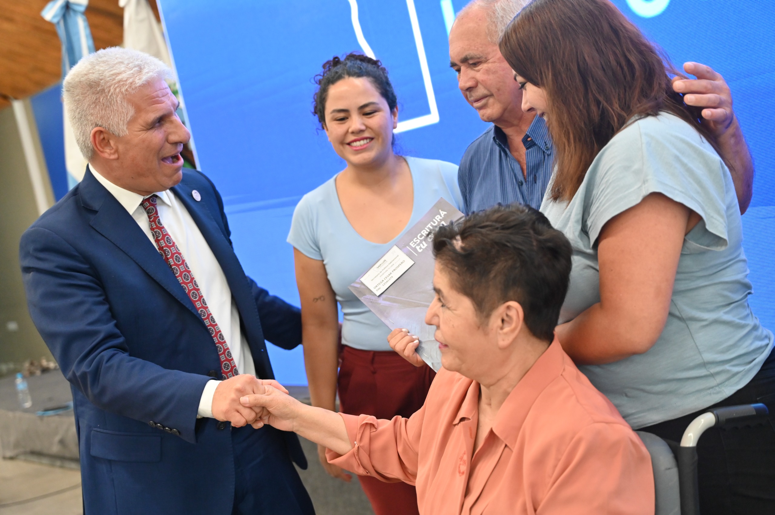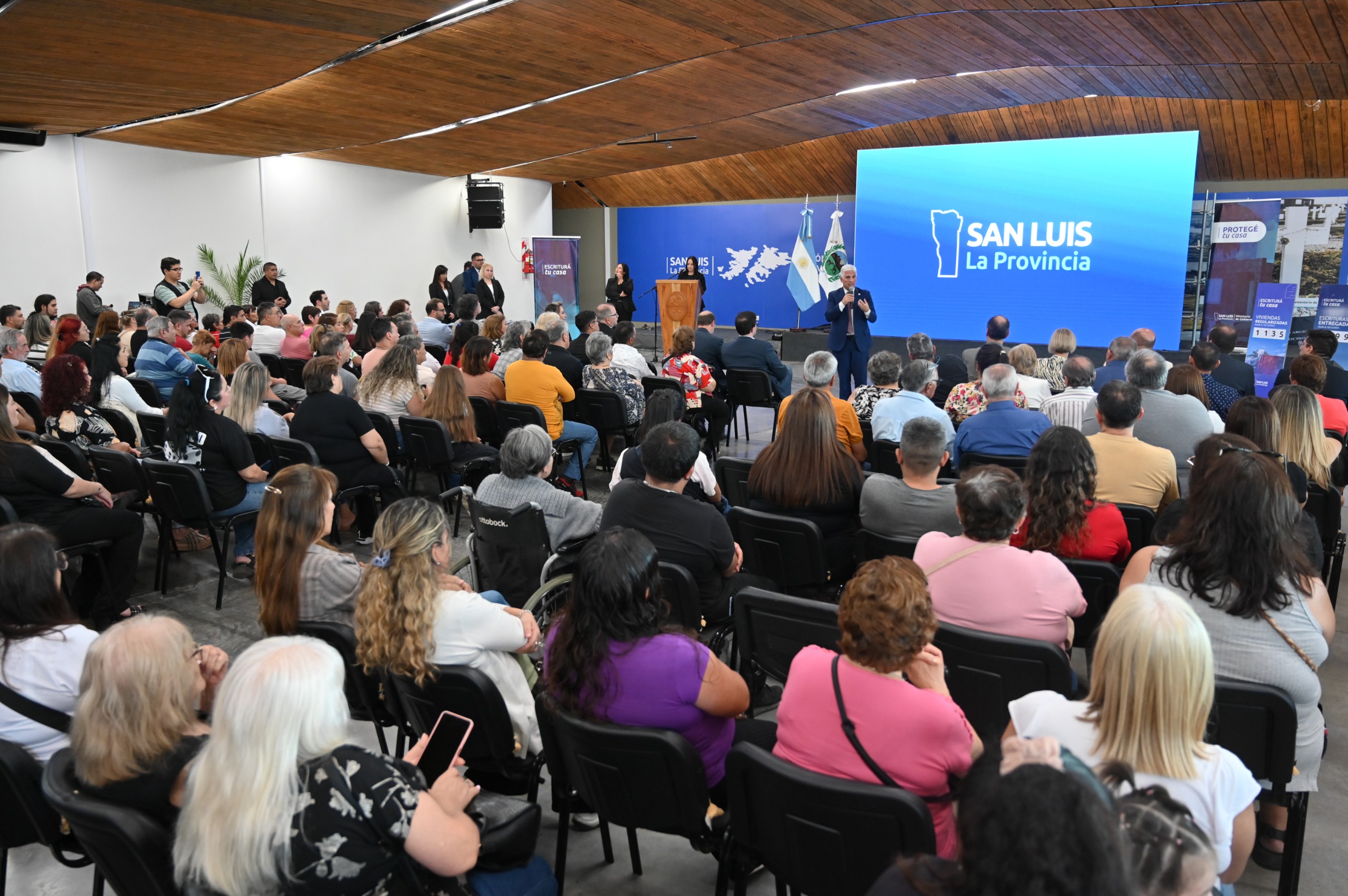 Este miércoles, pasadas las 18:30, el gobernador Claudio Poggi, entre aplausos y sonrisas, arribó al salón Malvinas Argentinas para entregar escrituras, decretos de regularización y actas de afectación de los programas ‘Escriturá tu Casa’ y ‘Protegé tu Casa’. Acompañados por sus familiares, los vecinos, protagonistas de la jornada, aguardaban expectantes el momento de ser llamados para acercarse al frente y recibir, de manos del Mandatario, la carpeta que simboliza un paso clave: dejar de ser adjudicatarios para convertirse en propietarios de sus hogares.
