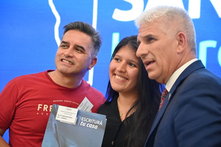 Durante el acto, el gobernador Claudio Poggi explicó que el origen del programa es simplificar el acceso a la escritura. “Cuando comenzó la gestión observábamos que muchas familias, que habían accedido a una vivienda por diferentes planes habitacionales, tenían muchas dificultades para escriturar. Había mucho tramiterío, idas y vueltas y una tasa de escrituración muy alta que no alentaba el trámite”, comentó.