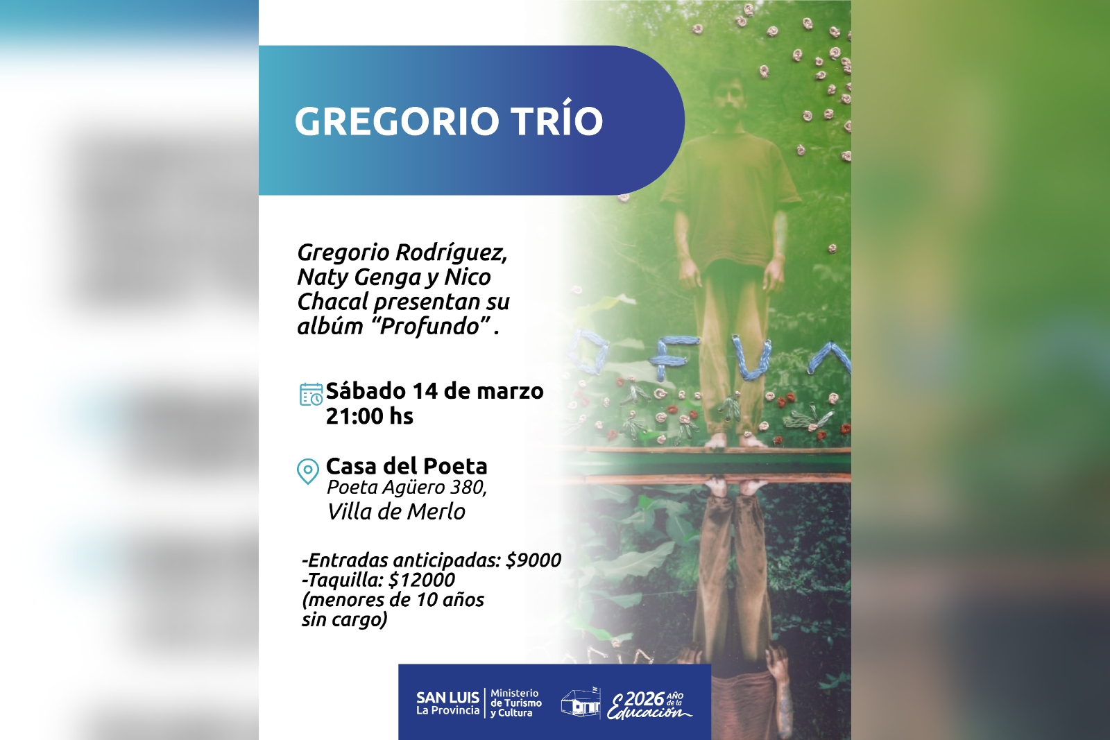 Quienes concurran este sábado por la noche a la Casa del Poeta Antonio Esteban Agüero de la Villa de Merlo podrán disfrutar del show en vivo de Gregorio Trío. Acompañado en percusión por Naty Genga y en bajo por Nico Chacal, el cantante y compositor de Carpintería, Gregorio Rodríguez desplegará el repertorio de nuevo álbum ‘Profundo’.