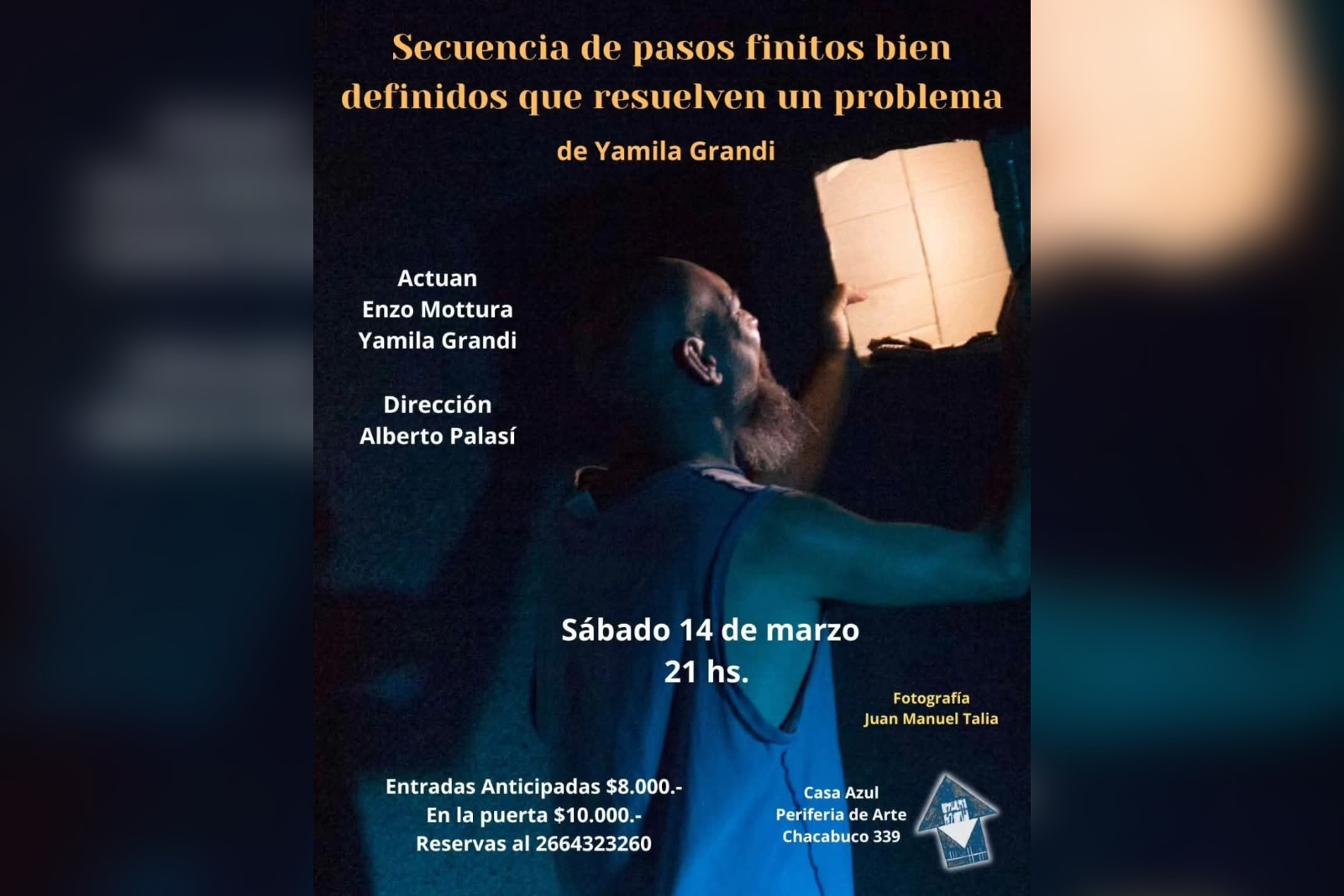La producción, apta para mayores de 16 años, subirá a escena este sábado 14, a las 21:00, en el espacio cultural Casa Azul que se encuentra en calle Chacabuco 339 de la capital provincial. Las entradas anticipadas tienen un valor de $8.000 por persona, aunque en boletería, previo a la función, costarán $10.000. Las reservas se pueden realizar al 2664-323260 (cupos limitados).