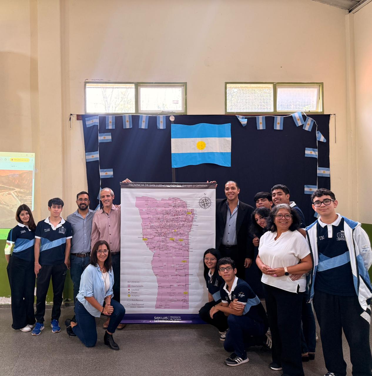 Durante el encuentro, el Ministro realizó la entrega de un mapa físico de la provincia de San Luis, donde se destacan las distintas localidades y parajes del territorio provincial, como herramienta educativa para fortalecer el conocimiento del patrimonio turístico y geográfico de San Luis.