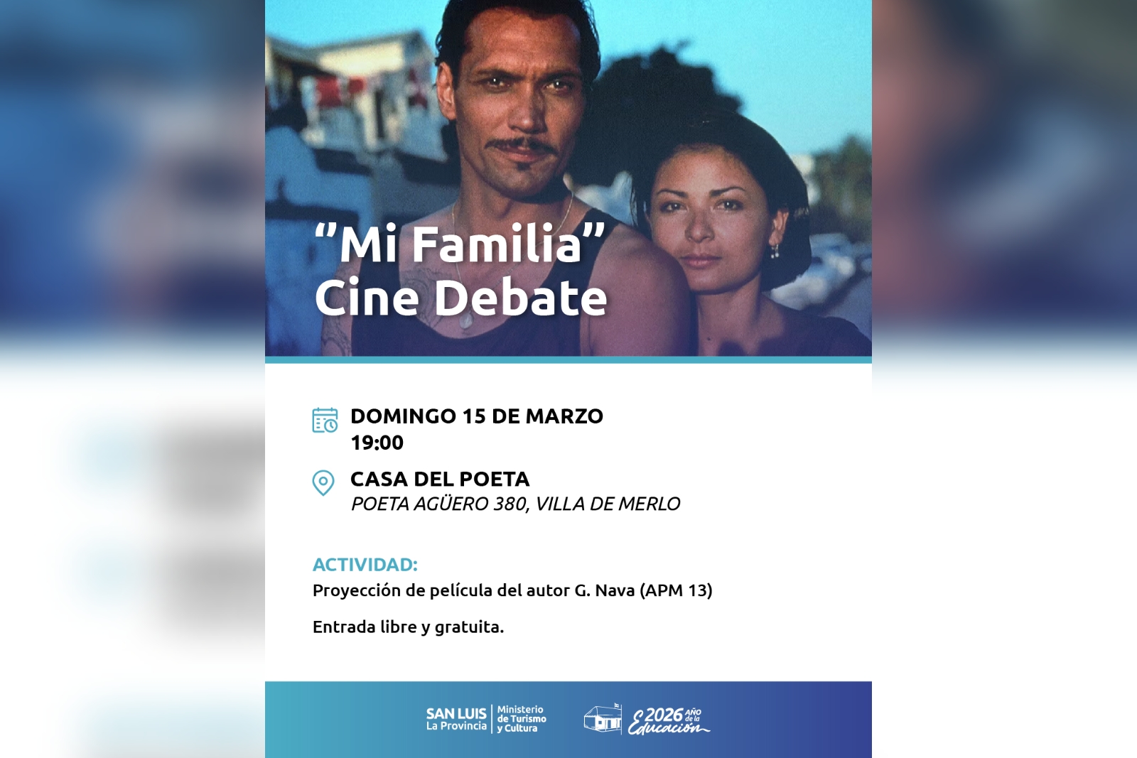 El público merlino tendrá la oportunidad de participar de un nuevo encuentro del Ciclo de Cine Debate, que se llevará a cabo este domingo 15 a las 19:00 en la Casa del Poeta ‘Antonio Esteban Agüero’. El espacio cultural pondrá en pantalla el film ‘Mi familia’, escrito y dirigido por Gregory Nava. Como siempre, la entrada será libre y gratuita.