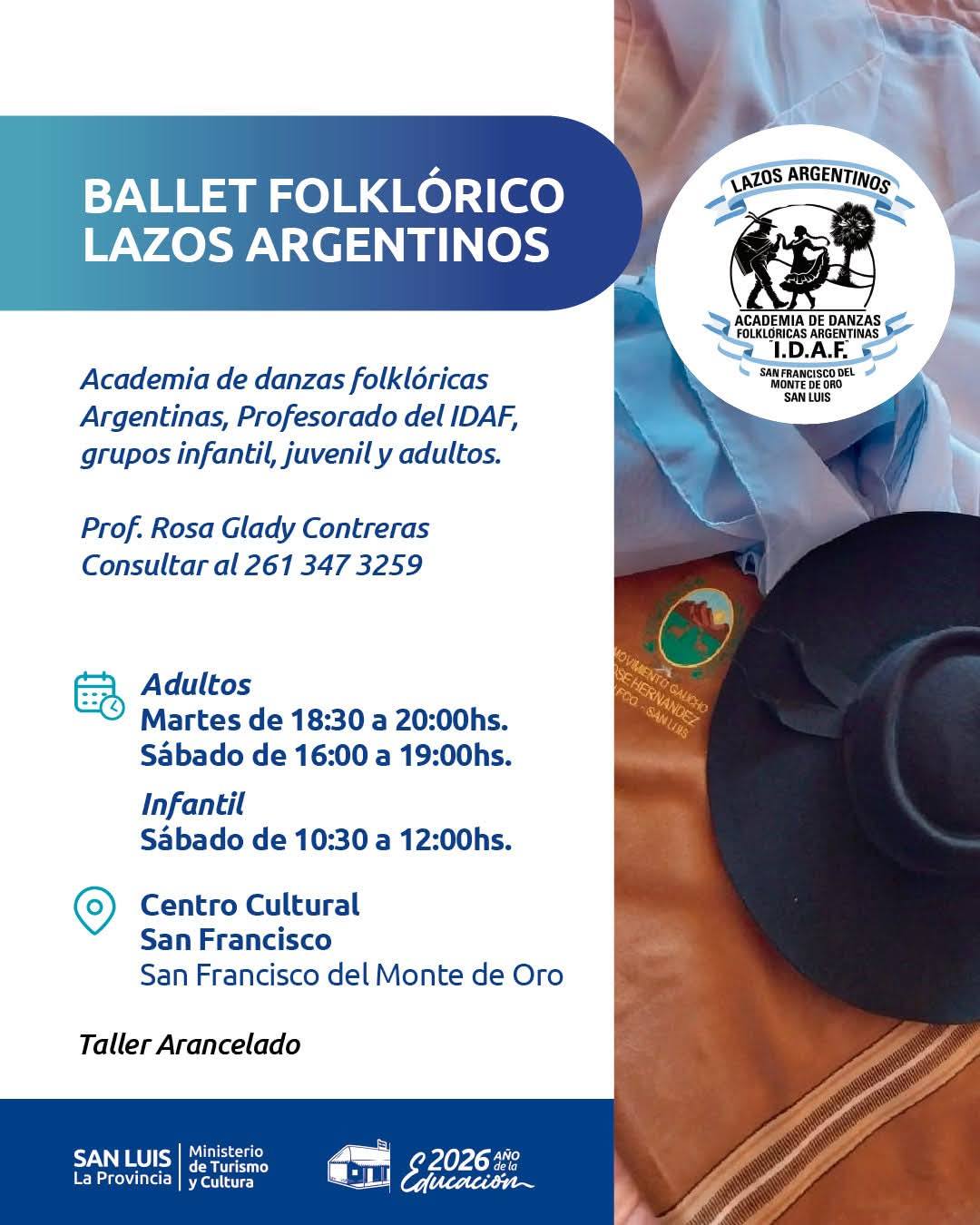 - Ballet Folclórico ‘Lazos Argentinos’ (infantil, juvenil y adultos): martes de 18:30 a 20:00 y sábados de 16:00 a 19:00; infantil los sábados de 10:30 a 12:00.