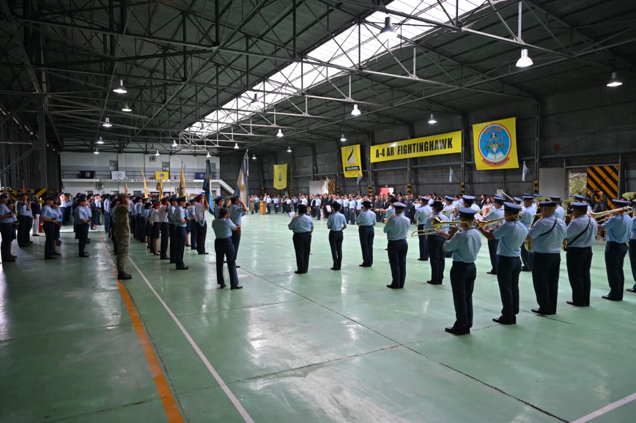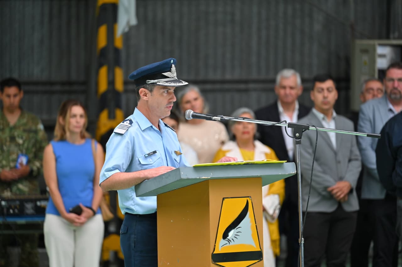 El jefe de la unidad destacó especialmente el desempeño de sus escuadrones “durante el conflicto del Atlántico Sur en 1982”, cuando pilotos, personal militar y civiles protagonizaron misiones de combate que marcaron una de las páginas más significativas de la Fuerza Aérea Argentina. En ese marco, rindió homenaje a los veteranos de guerra y al personal caído en cumplimiento del deber, subrayando que su ejemplo continúa guiando el accionar diario de la Brigada.