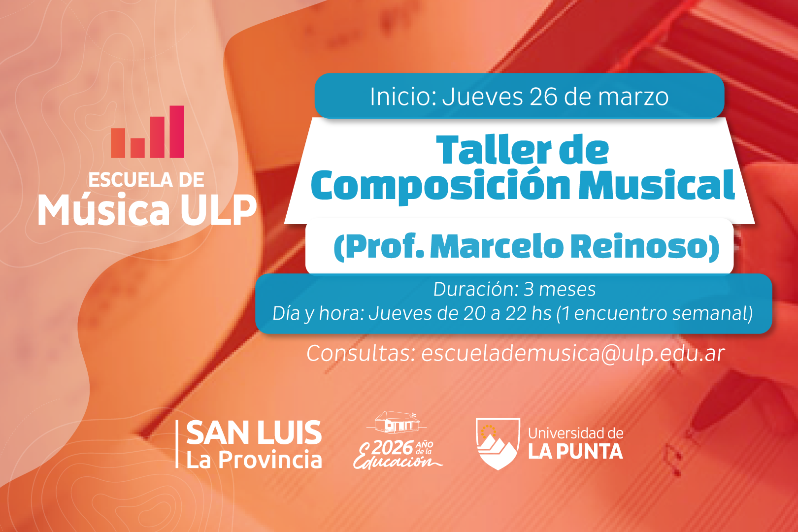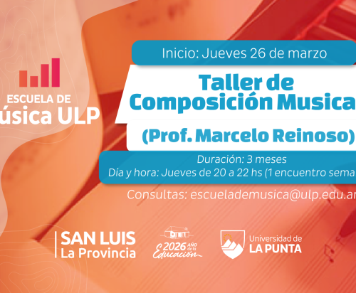 El área Arte y Comunidad de la Universidad de La Punta (ULP), a través de su Escuela de Música, invita a personas mayores de 16 años que tengan experiencia musical, instrumental vocal o en música digital (aunque no es indispensable) a participar del taller de Composición Musical que dictará el docente Marcelo Reinoso en la sede de la Escuela Pública Digital ‘Albert Einstein’ de la capital.