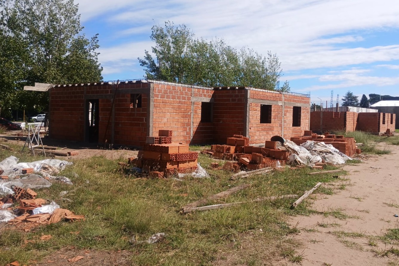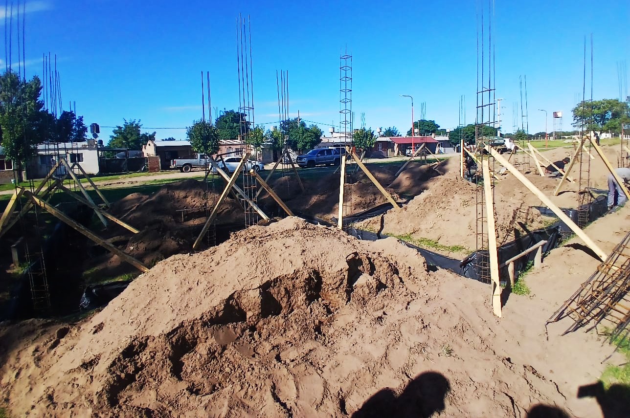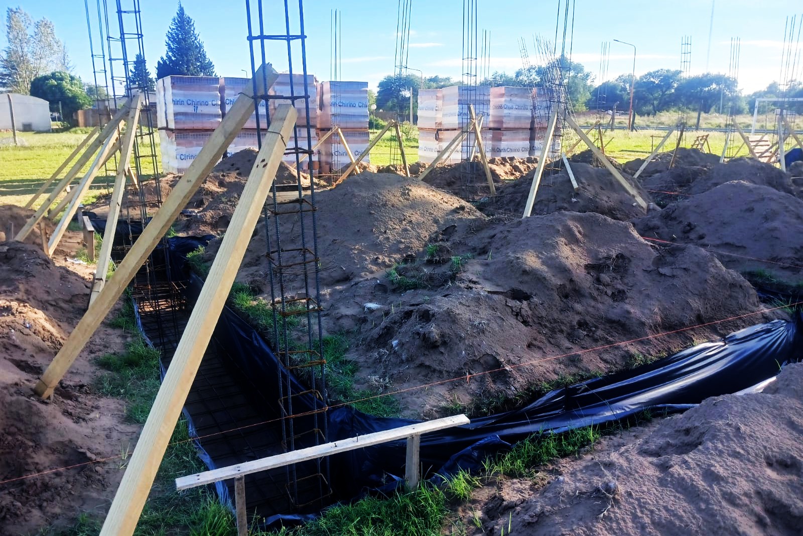 Identificaron armaduras de acero verticales ya posicionadas y arriostradas con madera, lo que indica el inicio de la estructura portante. Estas armaduras corresponden a futuras columnas de hormigón armado. Esta semana comenzarán con el llenado de las fundaciones con hormigón y ya cuentan con el acopio de ladrillo portante para el inicio de la próxima etapa.