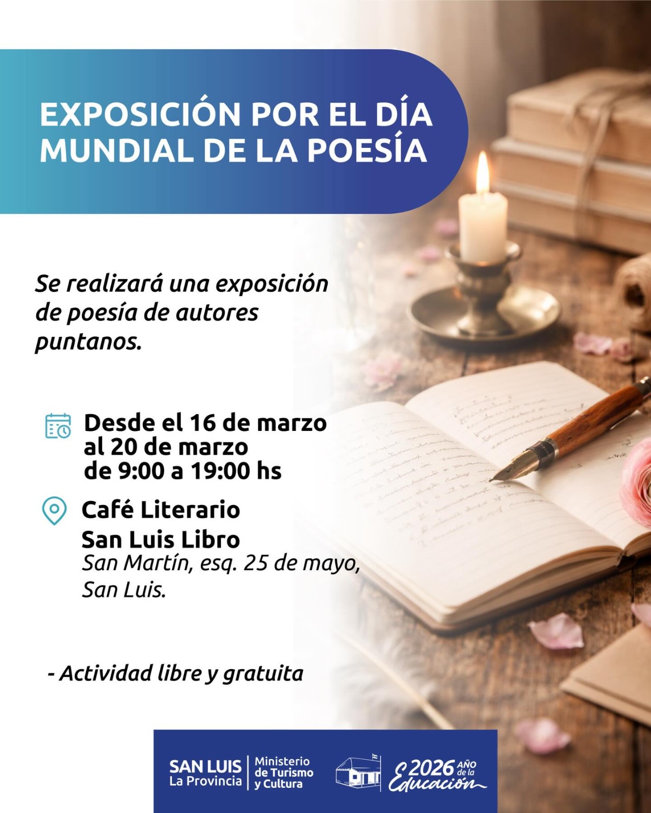 En el marco de esta conmemoración internacional, la provincia suma propuestas que acercan la poesía a la comunidad. Desde el 16 al 20 de marzo se desarrolla una exposición dedicada a autores puntanos en el Café Literario San Luis Libro, un espacio que se consolida como punto de encuentro cultural.