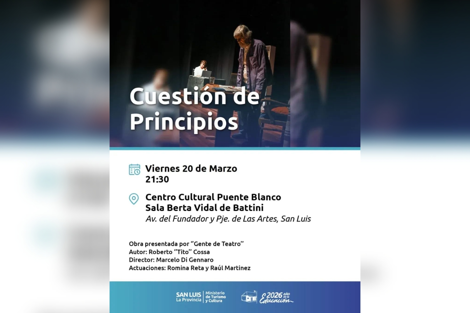 Este viernes, subirá al escenario de la sala ‘Berta Vidal de Battini’ la exitosa obra local ‘Cuestión de principios’, creada por el grupo ‘Gente de Teatro’. Las entradas para esta nueva función tienen un valor de $7.000 por persona y se pueden reservar comunicándose al teléfono 2664-275340. La cita es a las 21:30 y los organizadores solicitan la puntualidad de los espectadores.