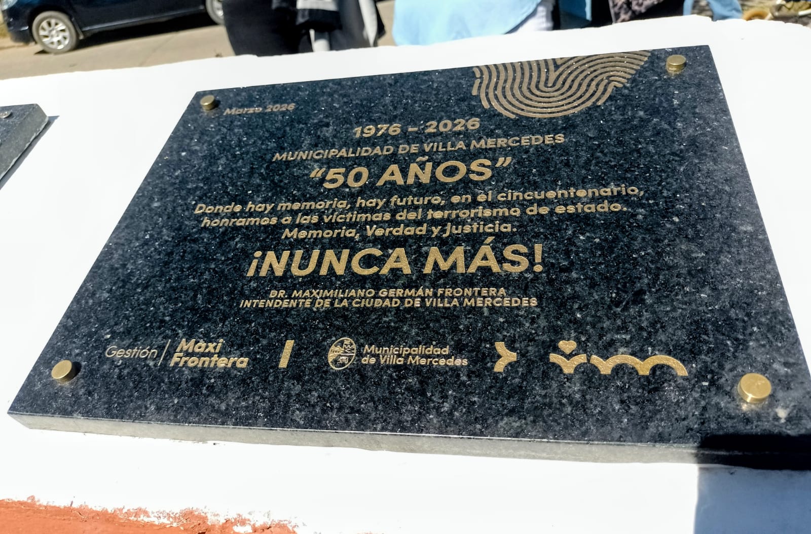 El acto culminó con el descubrimiento de una placa conmemorativa con la siguiente leyenda: “Donde hay memoria, hay futuro. En el cincuentenario, honramos a las víctimas del terrorismo de Estado. Memoria, Verdad y Justicia. ¡Nunca más!”. La placa quedará como testigo permanente del compromiso de Villa Mercedes con la memoria histórica.