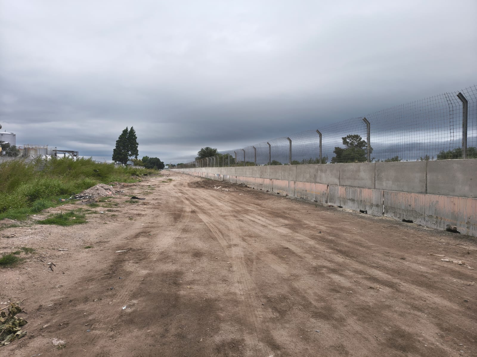 Los trabajos se concentran actualmente sobre la calle N°5, en el límite oeste, donde se avanza en el cierre utilizando estructuras tipo New Jersey, con encofrado de hormigón y colocación de tela malla. En paralelo, las tareas también progresan sobre la colectora de la Ruta Santos Ortiz, en el frente del predio.