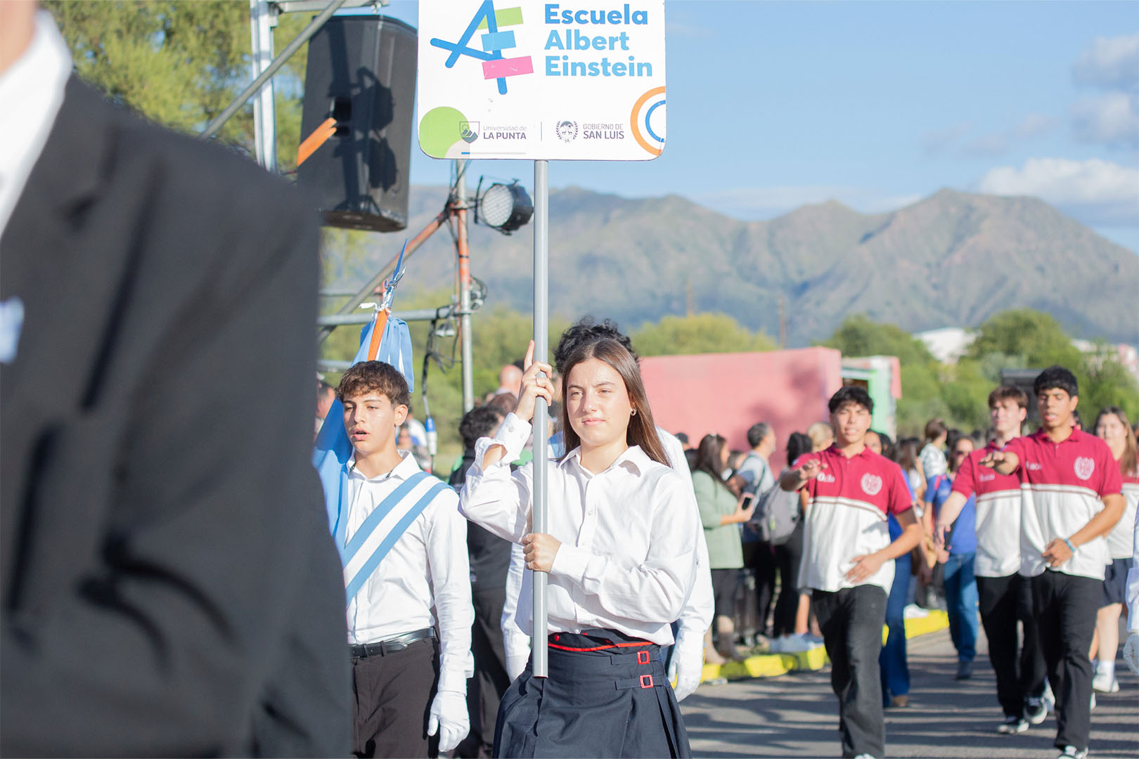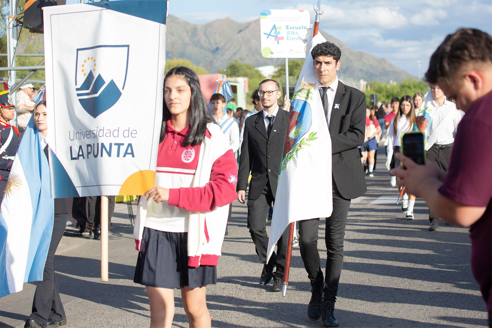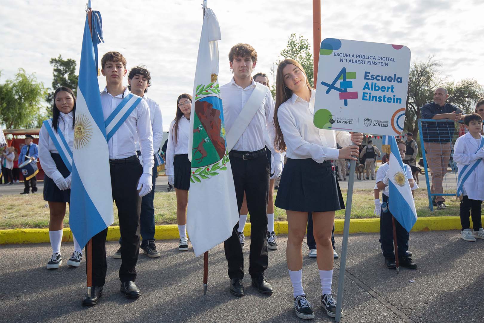 También participó la Escuela Pública Digital ‘Albert Einstein’. Los estudiantes de la promoción ‘Baudarios’ describieron la experiencia como novedosa, ya que es la primera vez que este establecimiento de la capital sanluiseña desfila en La Punta. Desde el palco oficial, saludaron a la delegación el director del Instituto de Ciencia y Tecnología, Luis Mercado, quien se encontraba junto al director de Capacitación y Enseñanza Escolar, Luciano Páez.