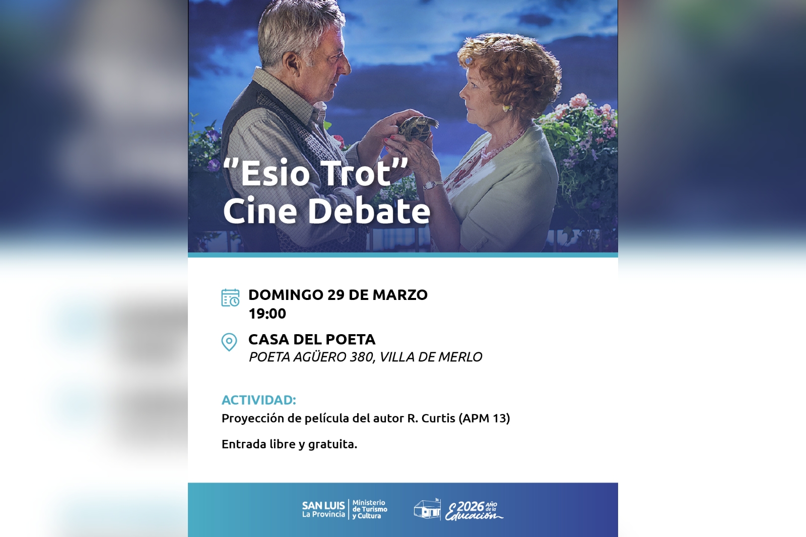 Al día siguiente, el domingo 29, llegará un nuevo encuentro del clásico ciclo de cine debate. En esta oportunidad, proyectarán la película ‘Esio Trot’, dirigida por Dearbhla Walsh y escrita por Richard Curtis y Paul Mayhew-Archer, como adaptación de la novela ‘Roald Dahl’. La cita es para las 19:00, con entrada libre y gratuita.