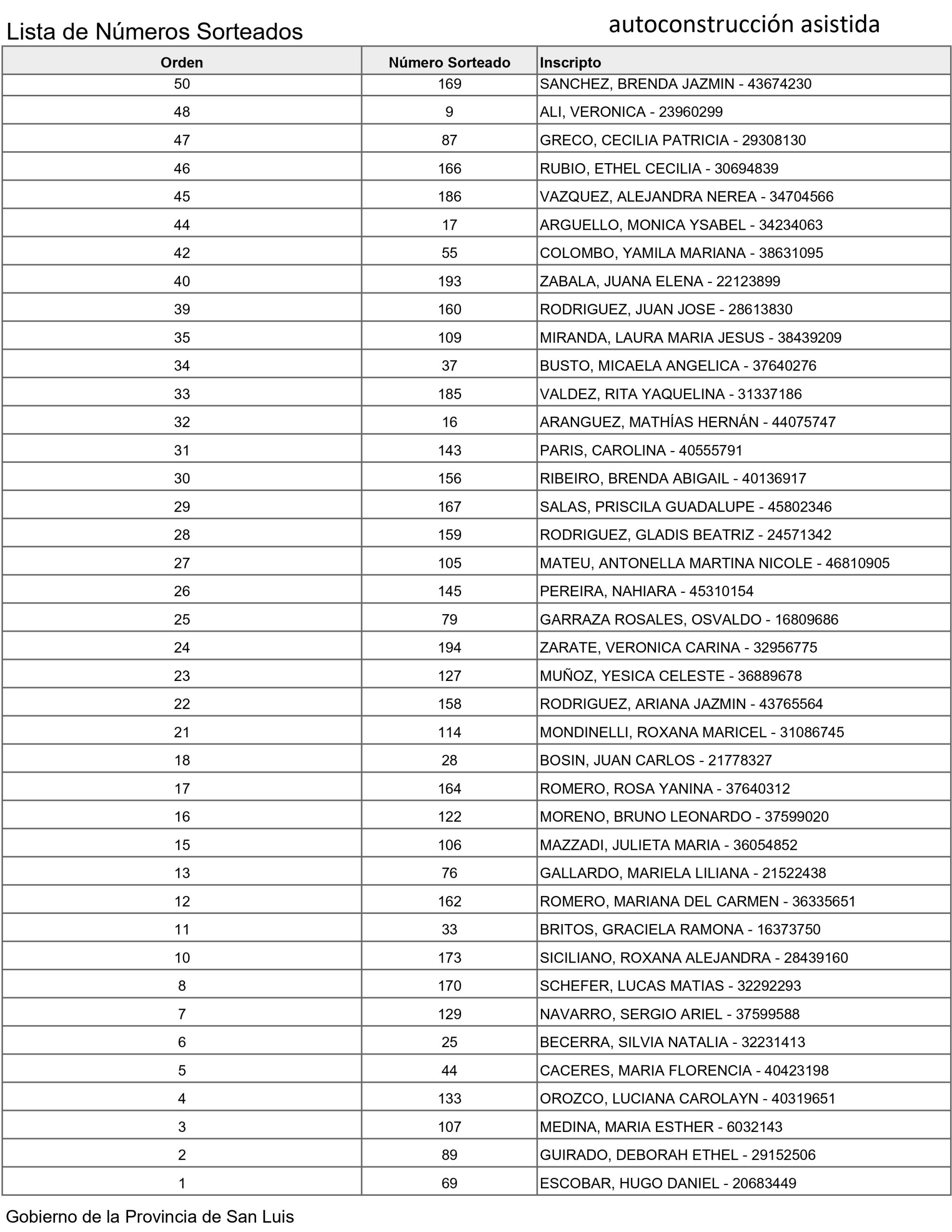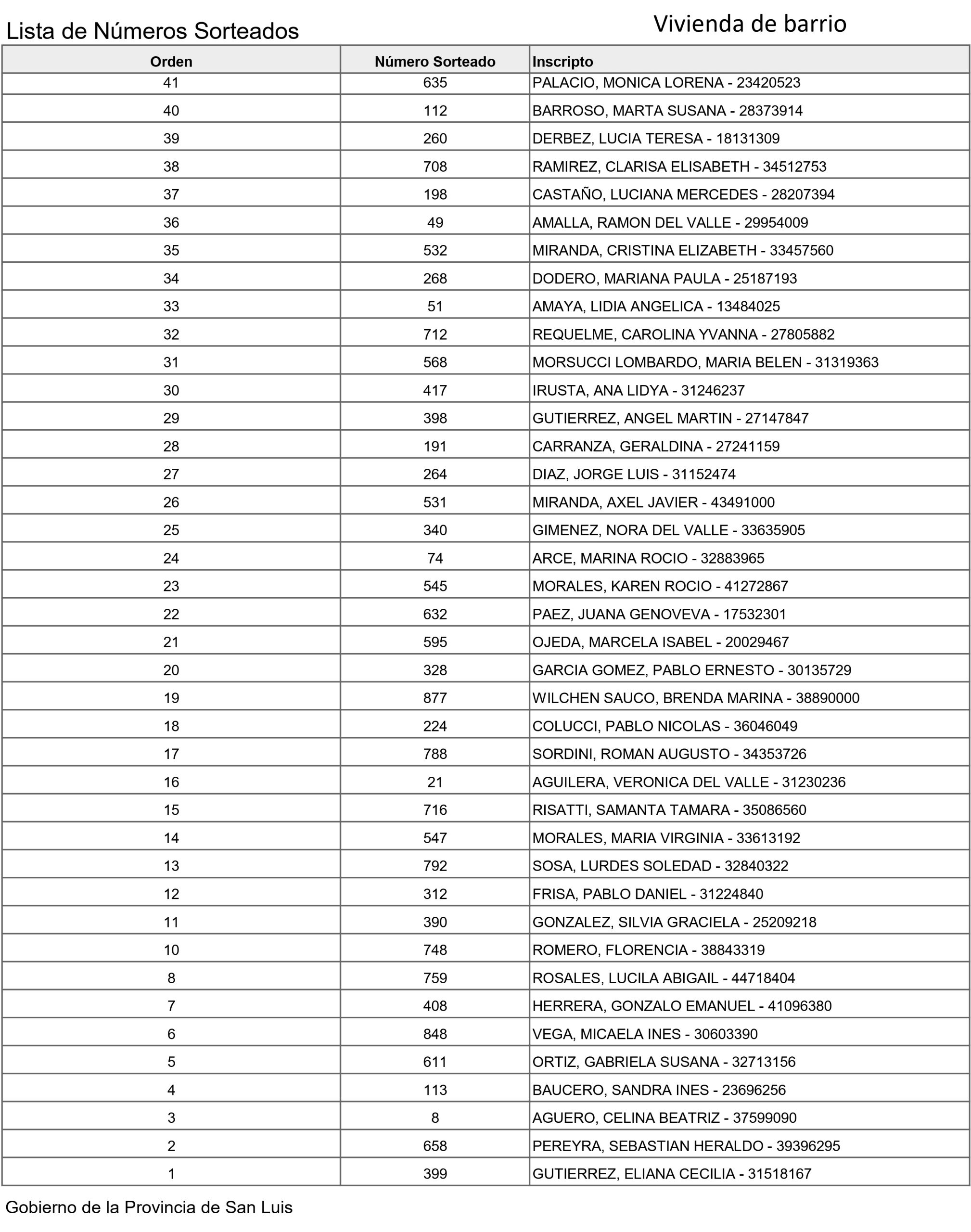 Resultados del sorteo de los inscriptos de Villa de Merlo