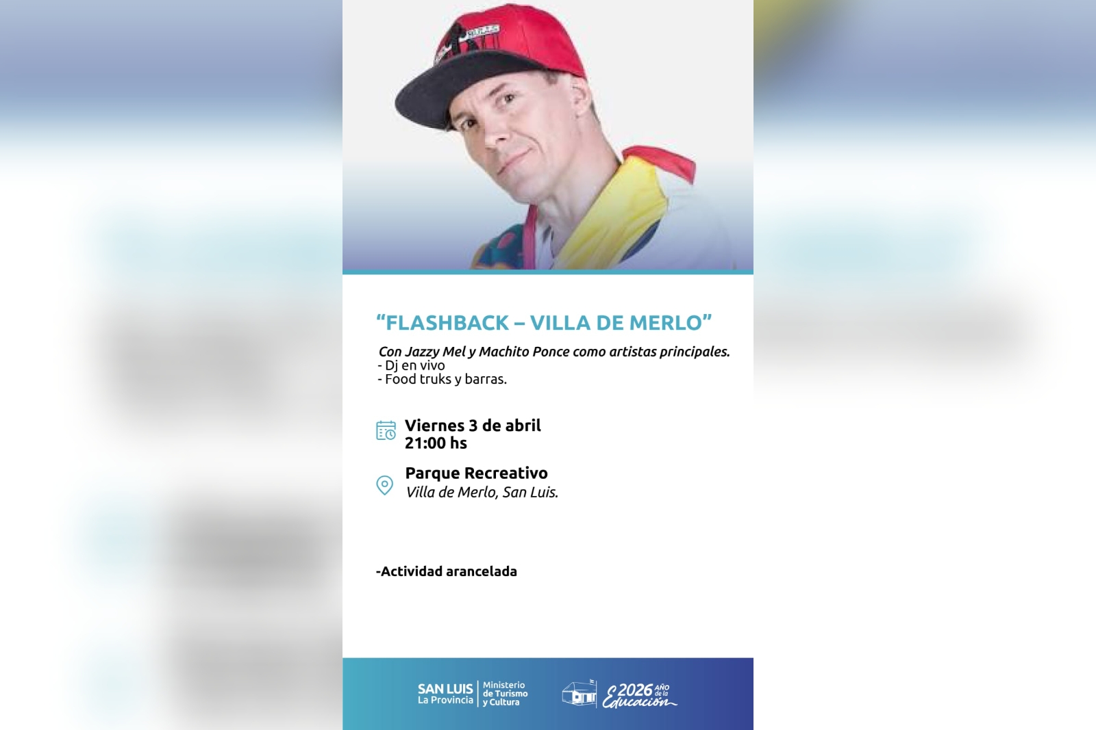 Esta nueva edición de ‘Flashback Villa de Merlo’ es organizada por Retro Talking Mix, productora responsable de distintas fiestas retro realizadas en la villa turística. Las entradas continúan a la venta a través de Passline en este link https://www.passline.com/eventos/flashback-jazzy-mel-machito-ponce. Para mayor información se encuentran habilitadas las consultas al 11-3651-7873.