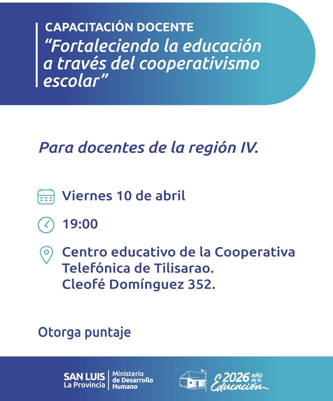 El ministerio de Desarrollo Humano dará continuidad al ciclo de capacitación docente sobre cooperativismo que inició en 2024 y cuenta ya con 470 formados. Esta nueva edición se denomina ‘Fortaleciendo la educación a través del cooperativismo escolar’ y comenzará el próximo 10 de abril a las 19:00 en el centro educativo de la Cooperativa Telefónica y Otros Servicios de Tilisarao.