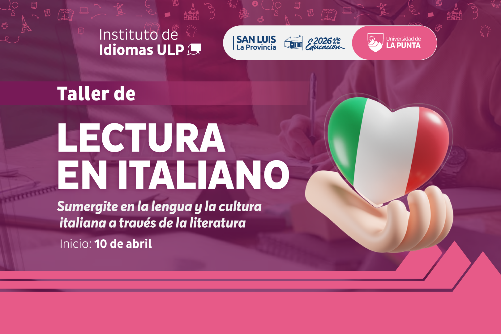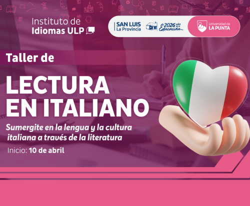 El Instituto de Idiomas de la Universidad de La Punta (ULP) propone un nuevo espacio de formación, en el que los interesados podrán incursionar en la lengua y la cultura italiana a través de la literatura, la lecturas de cuentos, el análisis e interpretación guiada, el intercambio de ideas en grupo y la producción oral y escrita de actividades creativas a través de textos.