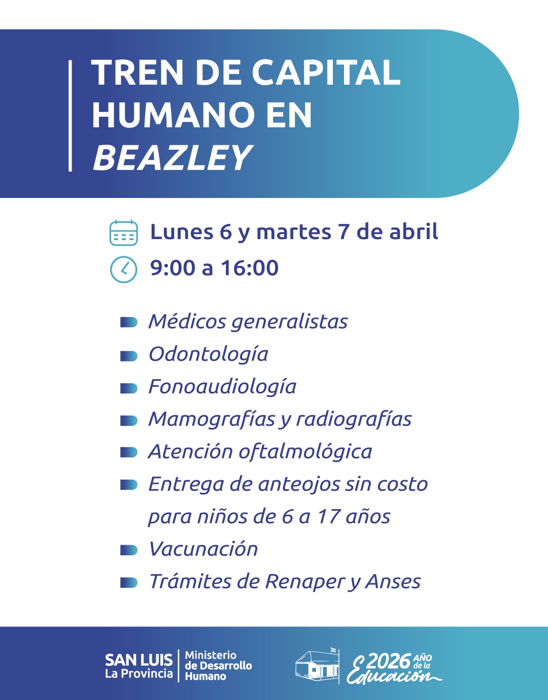 El tren de Capital Humano es una iniciativa de la secretaría Nacional de Niñez, Adolescencia y Familia y está diseñado para la detección temprana de diversas situaciones que atañen a la acción social y patologías de riesgo para la salud. Al Gobierno provincial le permite reforzar lo que ya realiza en materia social y de salud. Ya visitó la provincia a mediados del año pasado y se encuentra nuevamente en el territorio para prestar servicio durante casi todo el mes de abril.