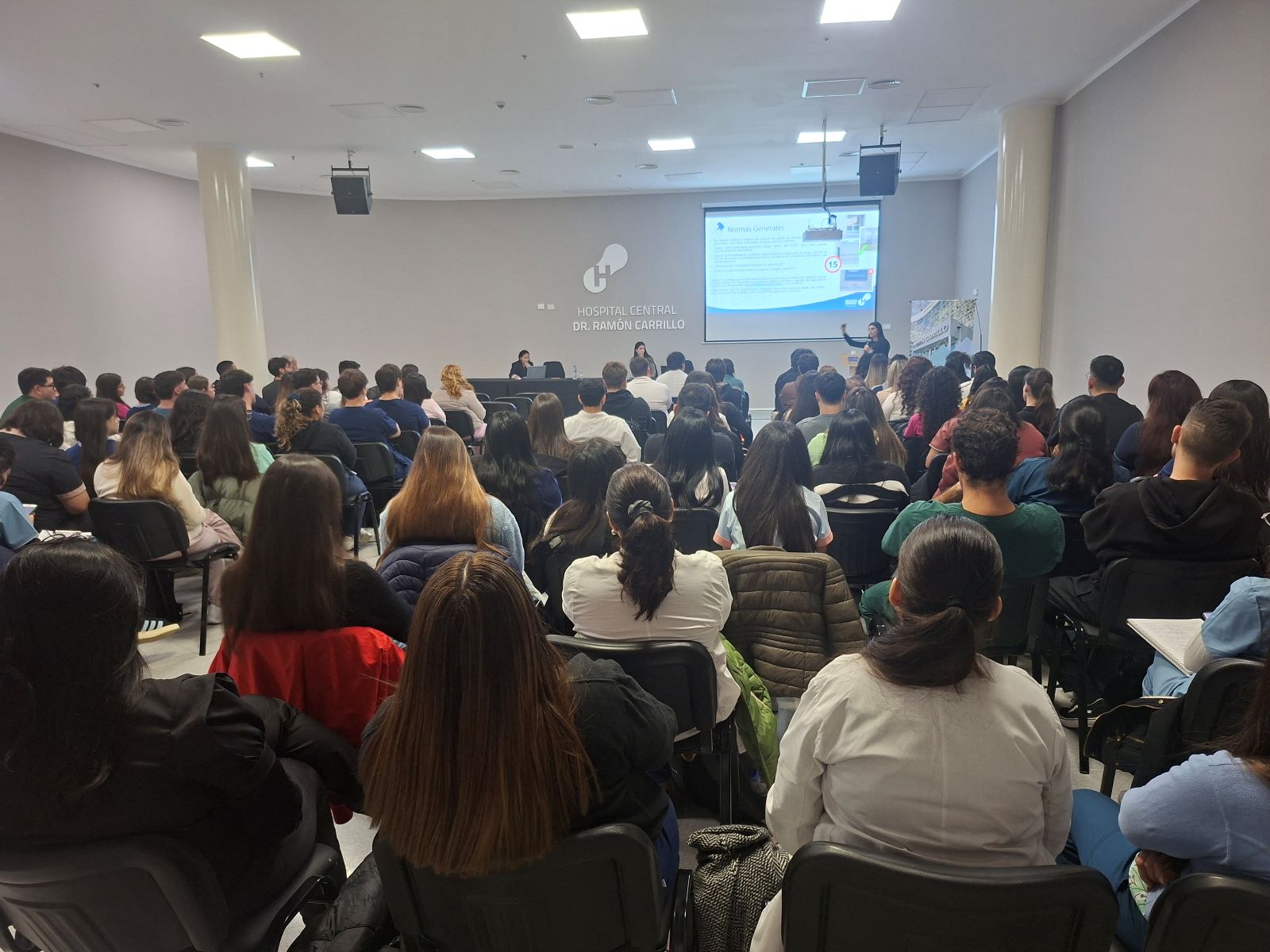 El ministerio de Salud, a través del Hospital Central ‘Dr. Ramón Carrillo’, comenzó a dictar capacitaciones a estudiantes de la carrera de Medicina de la Universidad Católica de Cuyo como parte de sus prácticas de pregrado. Este lunes, la jornada se organizó en dos comisiones: la primera para alumnos de 3° y 4° año y la segunda, a estudiantes de 5° y 6° año.