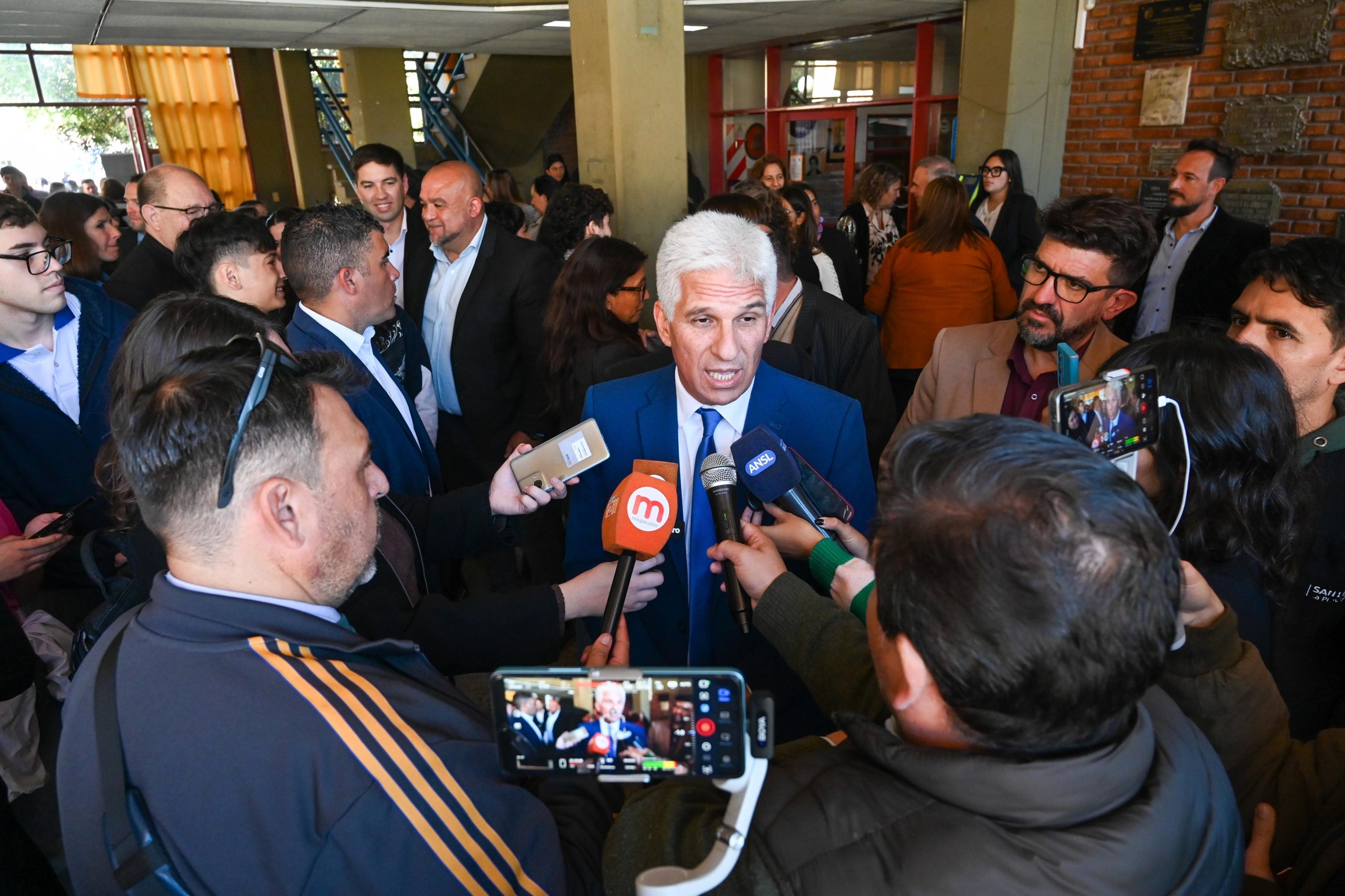 En un nuevo jueves con agenda de trabajo en Villa Mercedes, el gobernador Claudio Poggi dialogó con la prensa tras su paso por la Escuela Técnica N°18. Entre otros temas, se refirió a la intervención interministerial que se dio ante un posible caso de violencia escolar en una escuela de esa ciudad.
