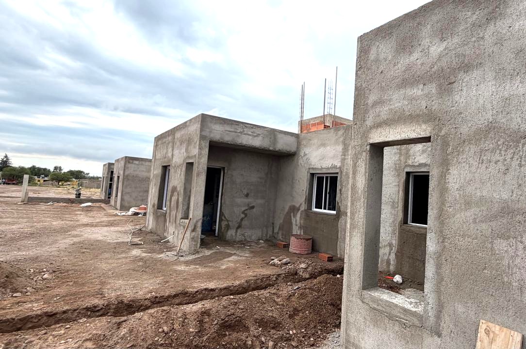En La Calera, en tanto, se construyen seis viviendas que presentan un grado de avance más elevado. La obra se encuentra en una etapa intermedia–avanzada, con la estructura y mampostería ya consolidadas, además de avances en revoques exteriores y colocación de aberturas. En paralelo, se ejecutan tareas vinculadas a instalaciones y terminaciones iniciales, lo que permitirá avanzar próximamente con los trabajos interiores, la colocación de carpinterías restantes y los detalles finales de obra.
