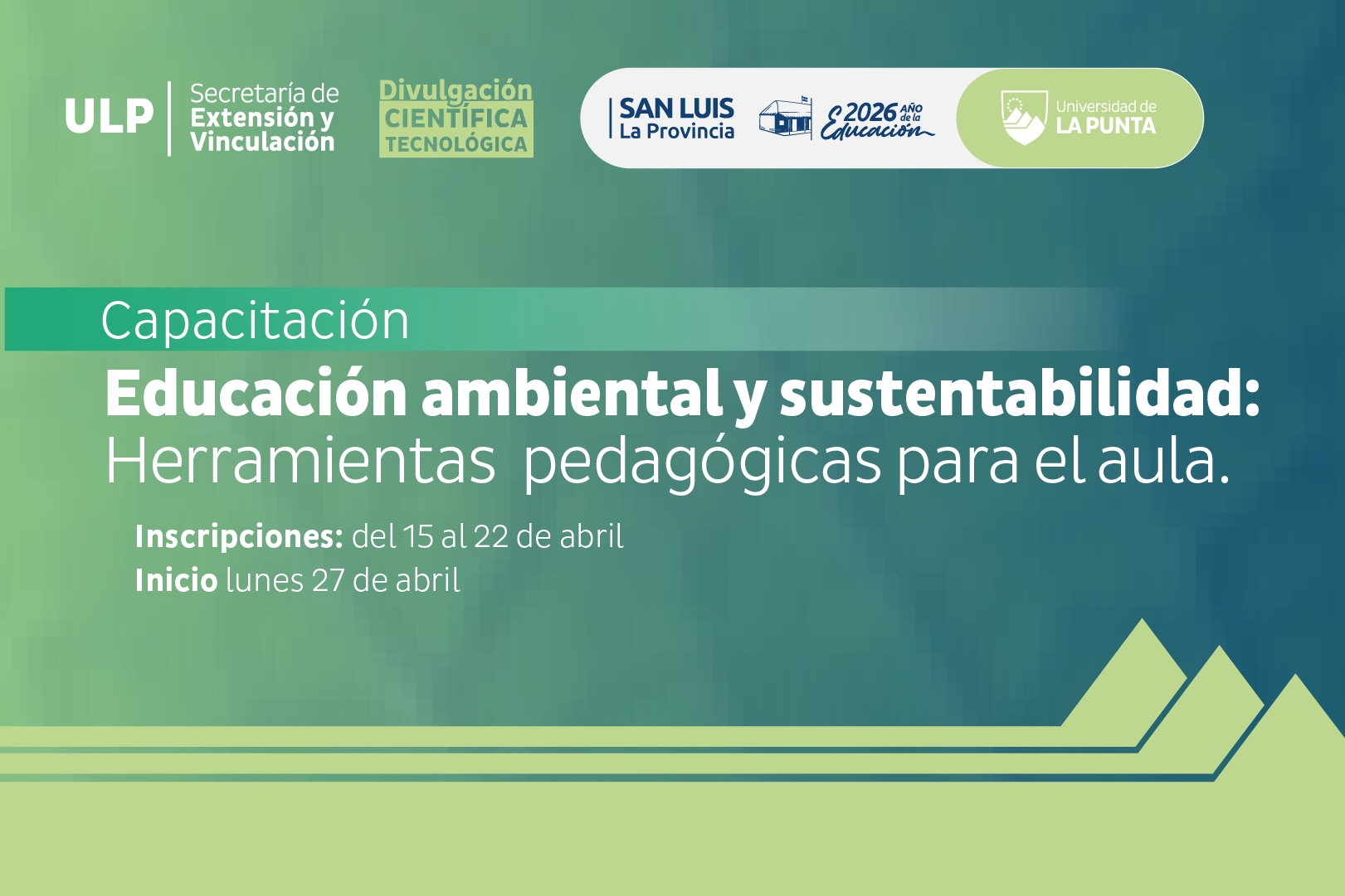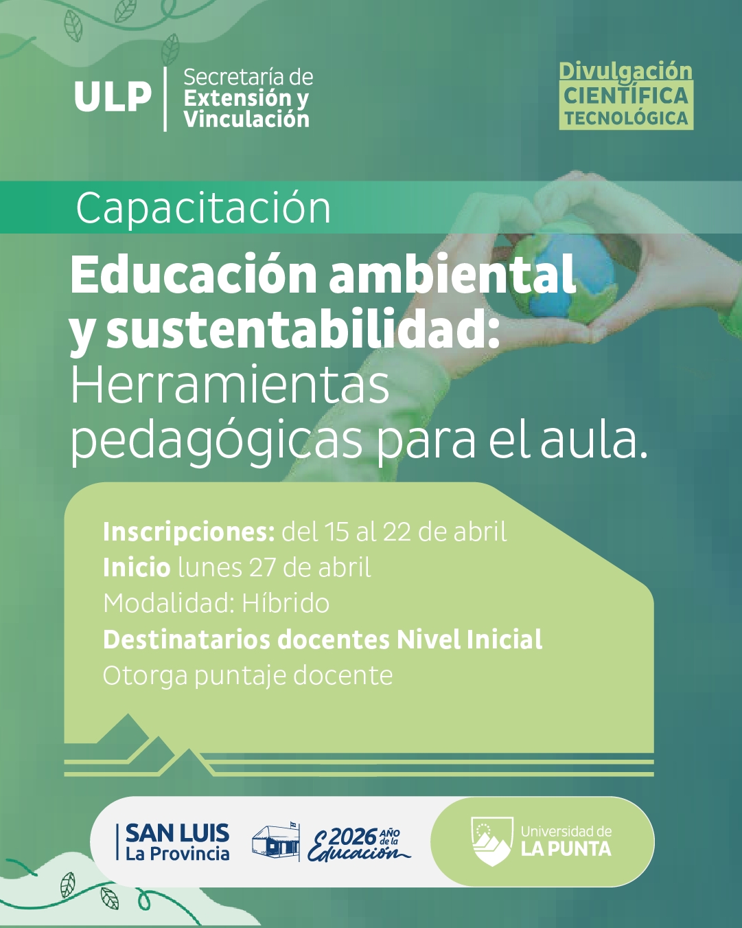 La Universidad de La Punta (ULP) a través del área de Divulgación Científica y Tecnológica del Parque Astronómico de La Punta (PALP) invita a docentes del nivel Inicial a sumarse a la capacitación en ‘Educación Ambiental y Sustentabilidad: herramientas pedagógicas para el aula’.