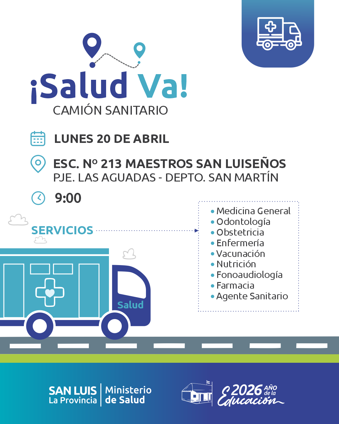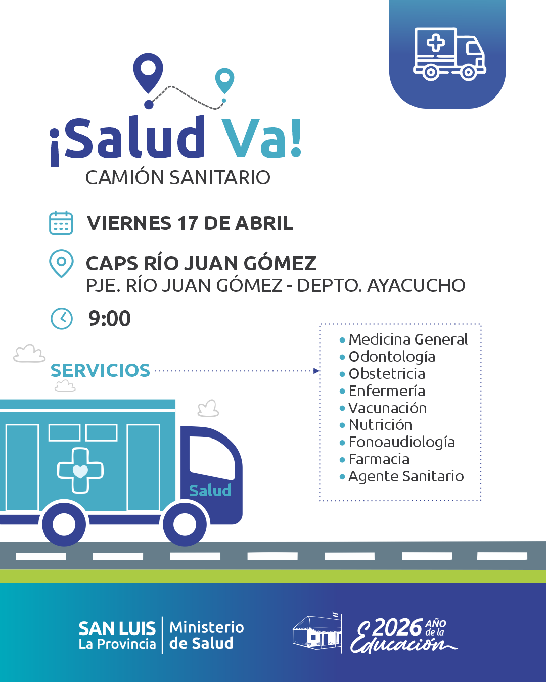 Con presencia territorial sostenida y una respuesta concreta en cada comunidad visitada, el dispositivo móvil ¡Salud Va! continúa consolidándose como una herramienta clave para ampliar el acceso a la salud en localidades y parajes alejados de los grandes centros urbanos. Desde el inicio de su recorrido 2026, el Camión Sanitario ya concretó cinco operativos en distintos puntos de la provincia y brindó atención a 241 personas.
