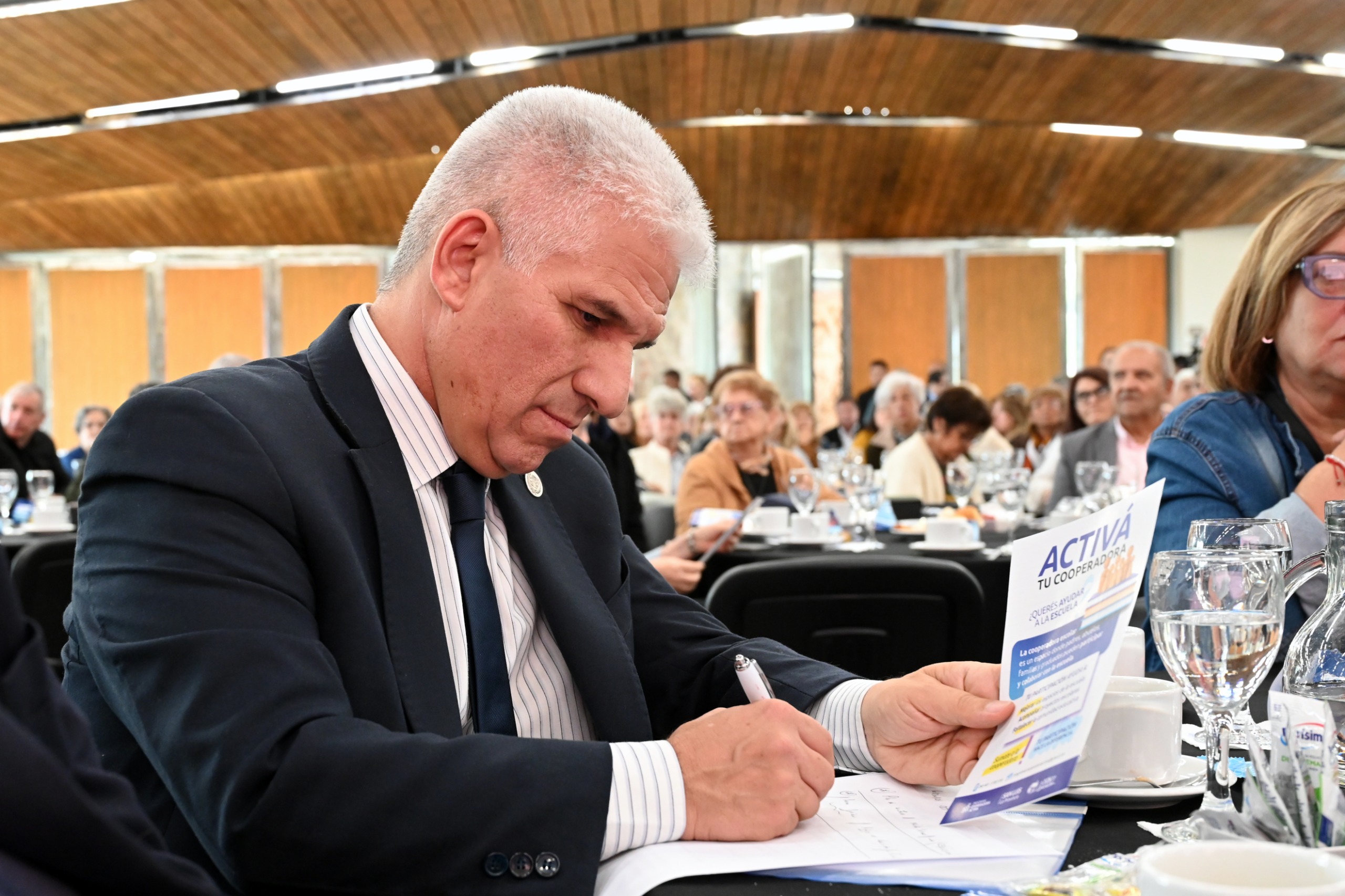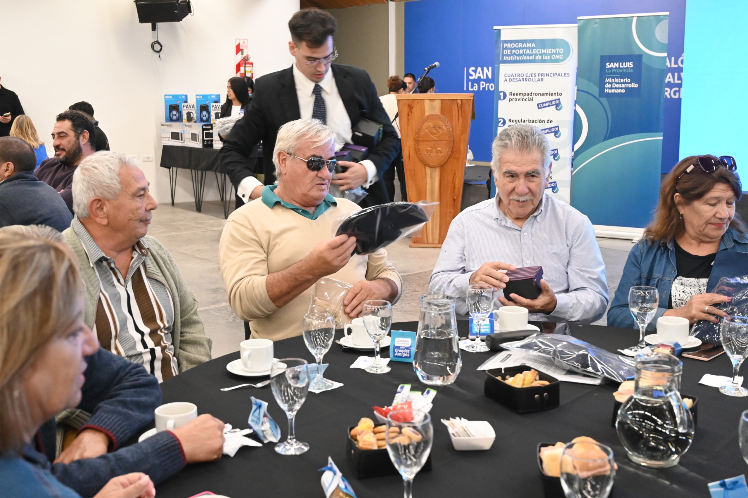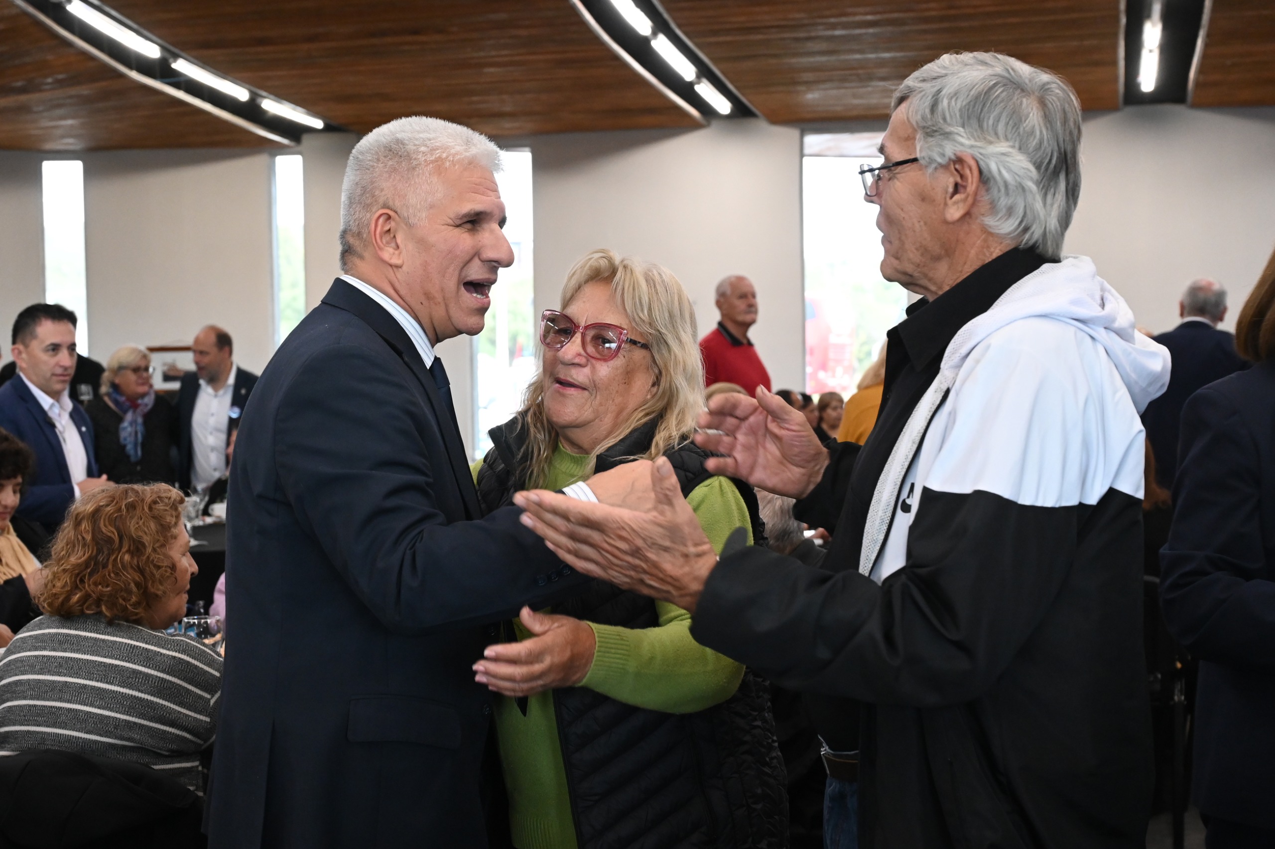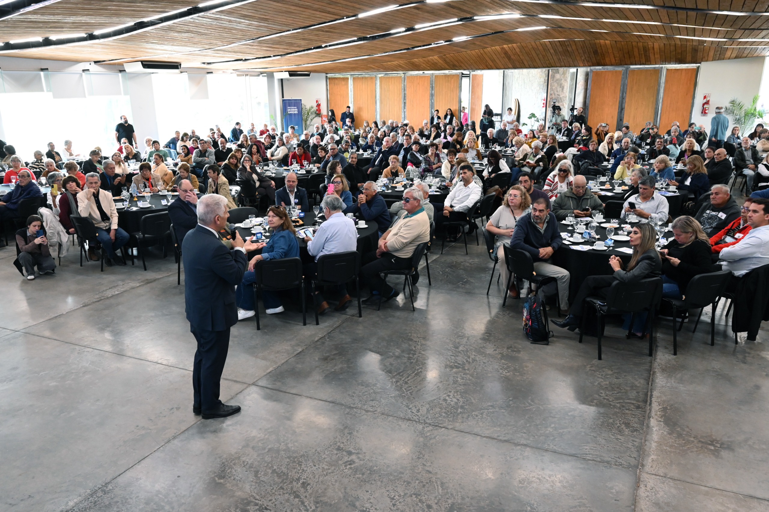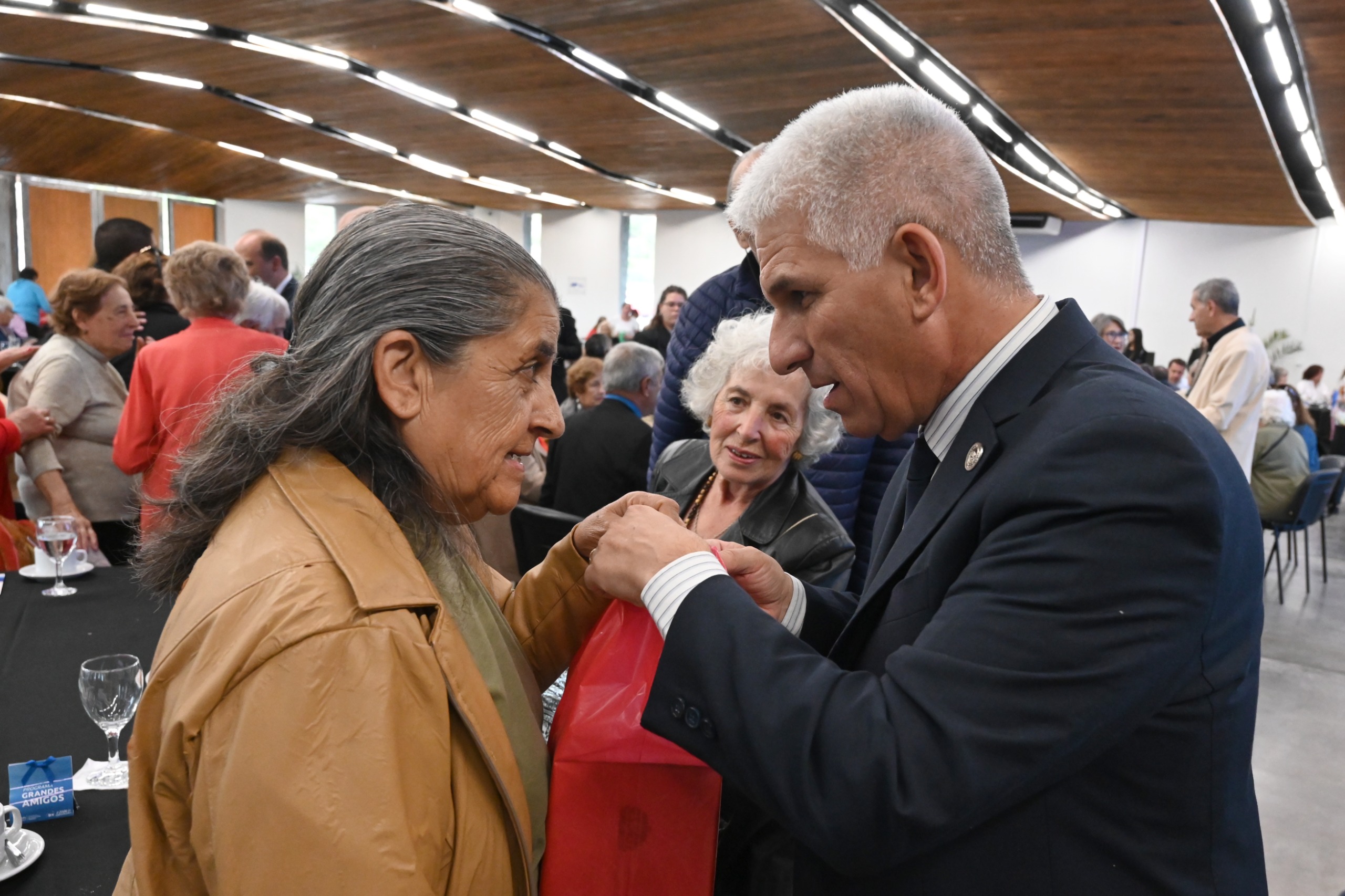 Fiel a su estilo, Poggi saludó a cada uno en sus mesas antes de ocupar su lugar. “Es un gusto recibirlos, un gusto reencontrarme con ustedes y felicitaciones. A cada equipo de Gobierno, al ministerio de Desarrollo Humano y a todo el equipo que son parte del programa ‘Grandes Amigos’, que cada año va creciendo. Todo el Gobierno está alineado para apoyar y apuntalar al programa para trabajar codo a codo con los centros de jubilados de la provincia”, les dijo al tomar el micrófono.
