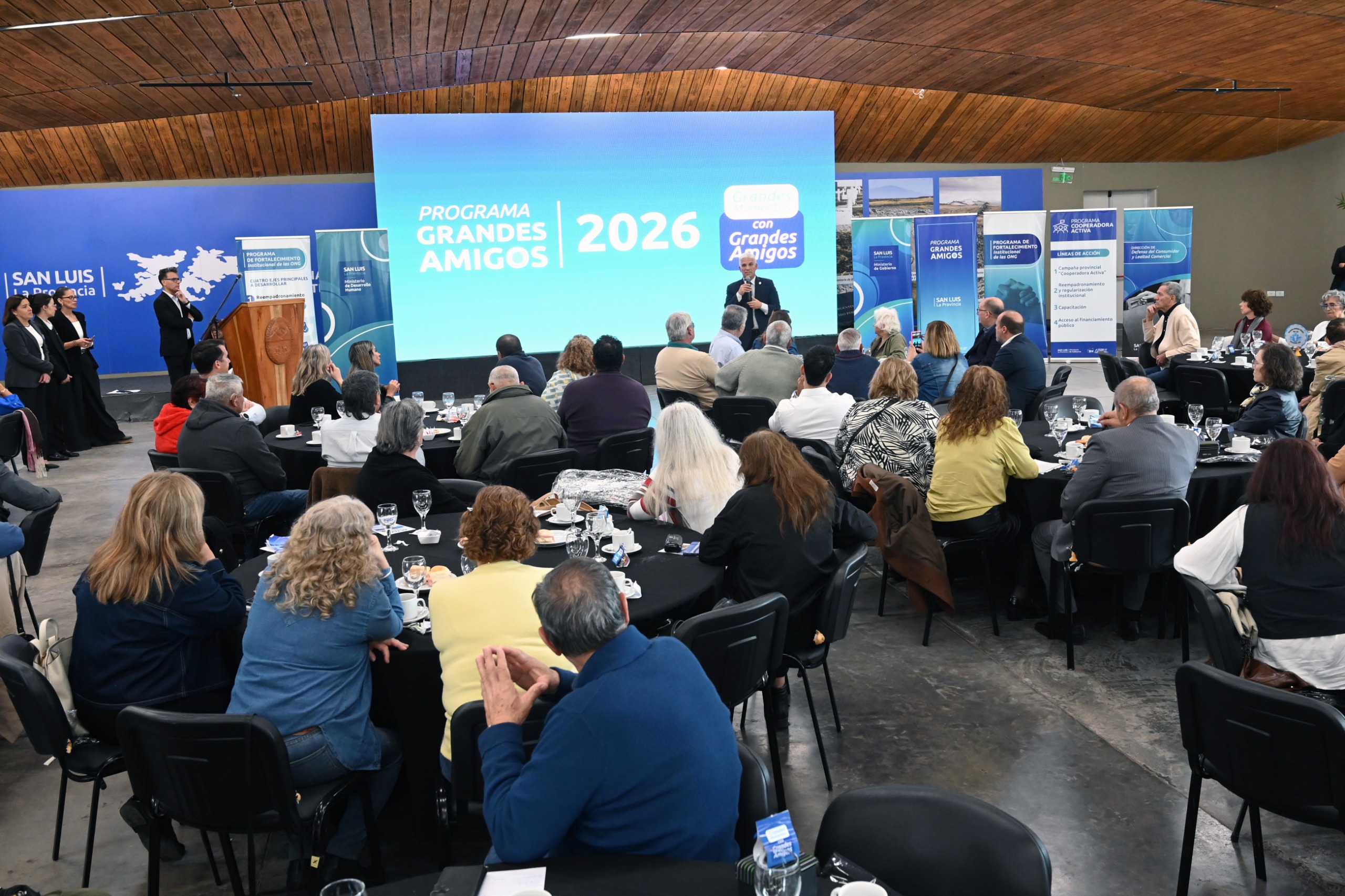 Este miércoles, el Salón Malvinas Argentinas de Casa de Gobierno se colmó con la energía de adultos mayores de toda la provincia. En una jornada de camaradería e intercambio, dirigentes de 62 centros de jubilados compartieron un desayuno con el gobernador Claudio Poggi y gran parte de su gabinete, que presentaron las propuestas del programa ‘Grandes Amigos 2026’.
