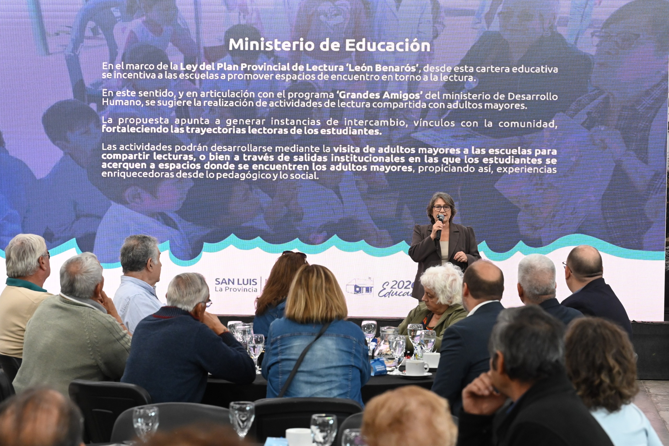 Olga García, asesora del ministerio de Educación, le propuso al auditorio que este año, los integrantes de los centros de jubilados participen del Plan de Alfabetización que lleva adelante el Ejecutivo acercándose a escuelas, bibliotecas e instituciones educativas “para promocionar la lectura, que es una de las bases, de los pilares para el tema de la alfabetización. Aquel que no escribe o no sabe leer difícilmente después comprenda, entonces va a ser muy importante el aporte de ustedes para apoyar esta línea del Gobierno. Ustedes también pueden ir más allá de lecturas, escritos o libros de literatura y presentar cosas escritas por ustedes y compartir a los alumnos lo importante que es saber leer, expresarse y comunicarse”.