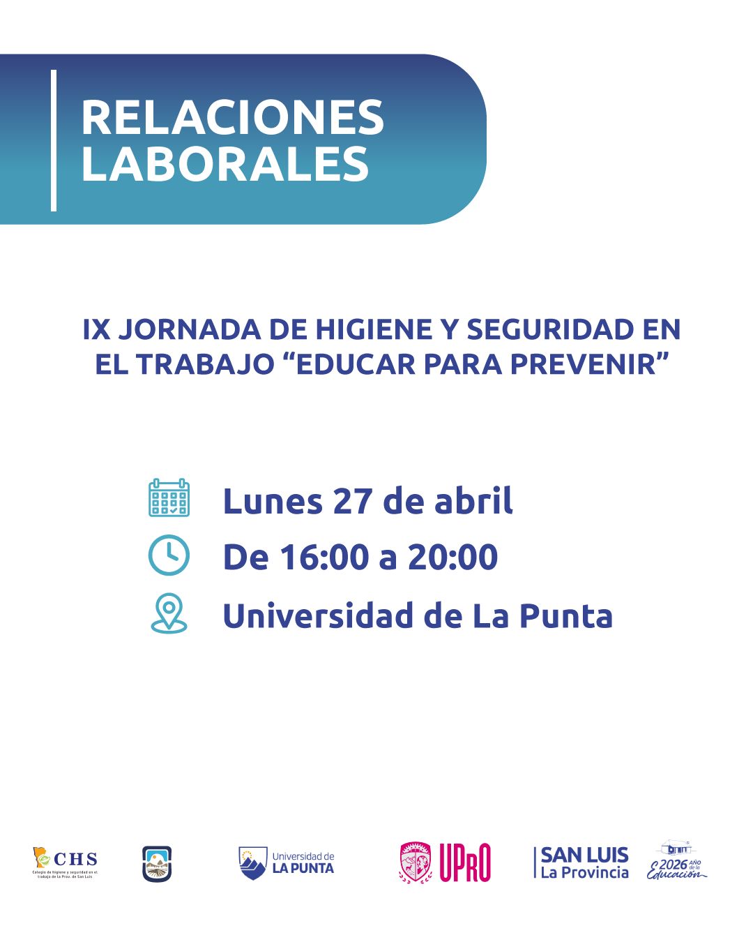 Realizarán la IX Jornada de Higiene y Seguridad: Articulación interinstitucional para ‘Educar para Prevenir’. La actividad es un claro ejemplo de articulación entre el sector público, el académico y el profesional. La organización corre por cuenta de la dirección de Relaciones Laborales en conjunto con la Universidad de La Punta (ULP) y la Universidad Provincial de Oficios (UPrO). Pero, además, cuenta con la adhesión de actores de peso como la Universidad Nacional de San Luis (a través de la Facultad de Química, Bioquímica y Farmacia) y el Colegio Profesional de Higiene y Seguridad.