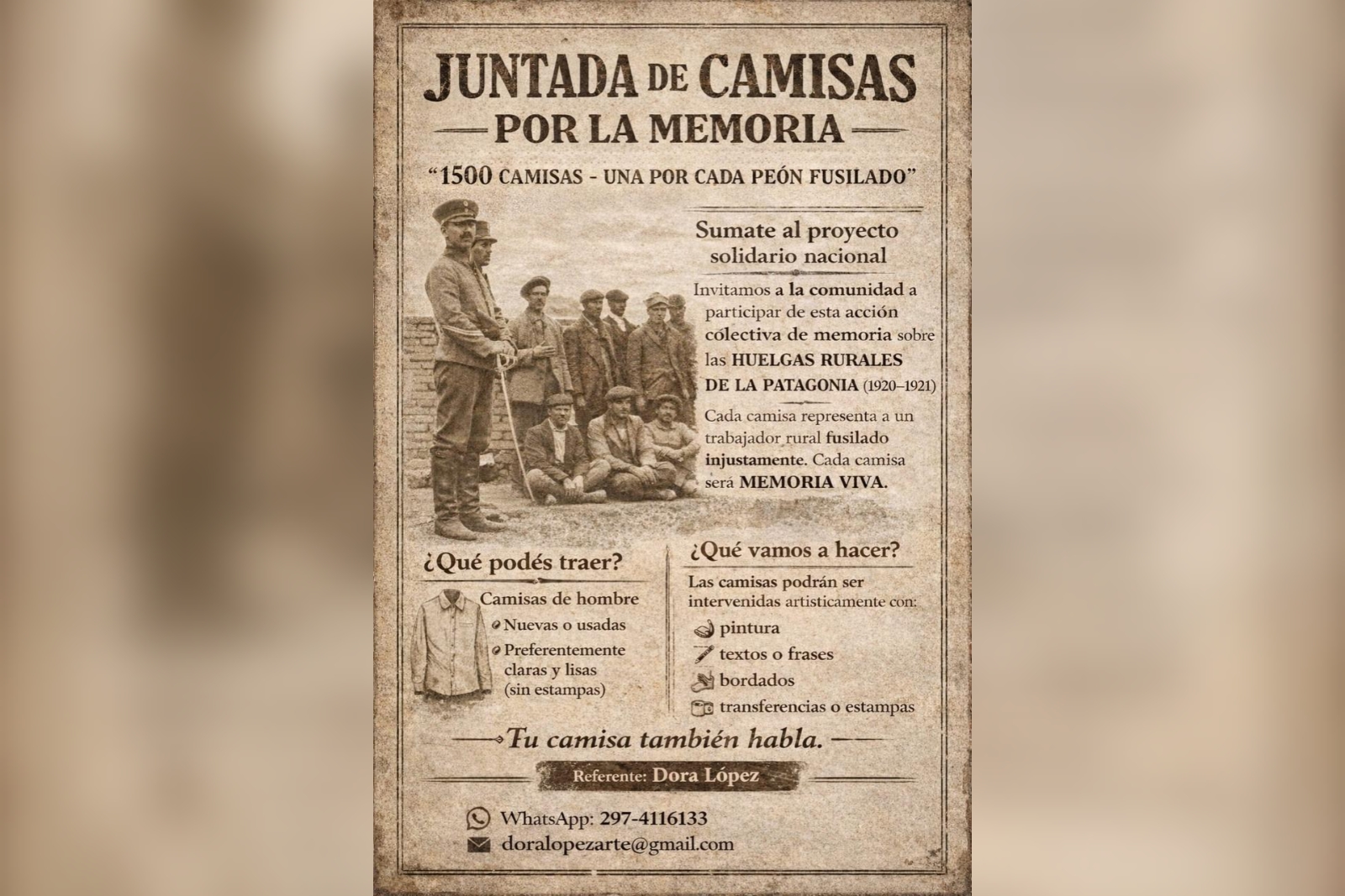 Bajo esa premisa, el objetivo para este año es recolectar 1.500 camisas a lo largo de todo el país por la memoria de los trabajadores rurales asesinados durante las huelgas patagónicas que acontecieron entre 1920 y 1922. Puntualmente, se convoca a donar camisas de hombre, nuevas o usadas, que luego serán intervenidas artísticamente con frases, dibujos, bordados o textos vinculados a la memoria de la Patagonia Rebelde. Cada prenda representará simbólicamente a uno de los peones fusilados.