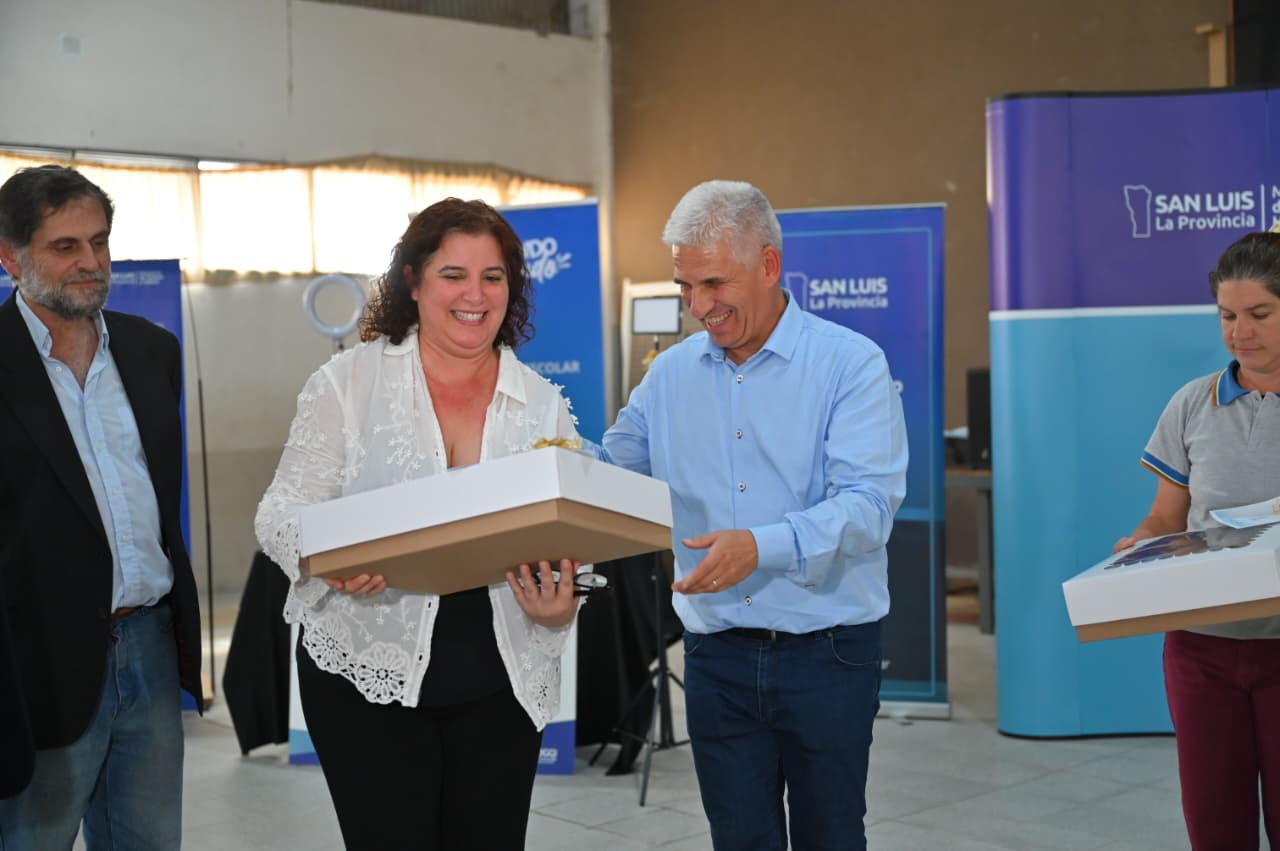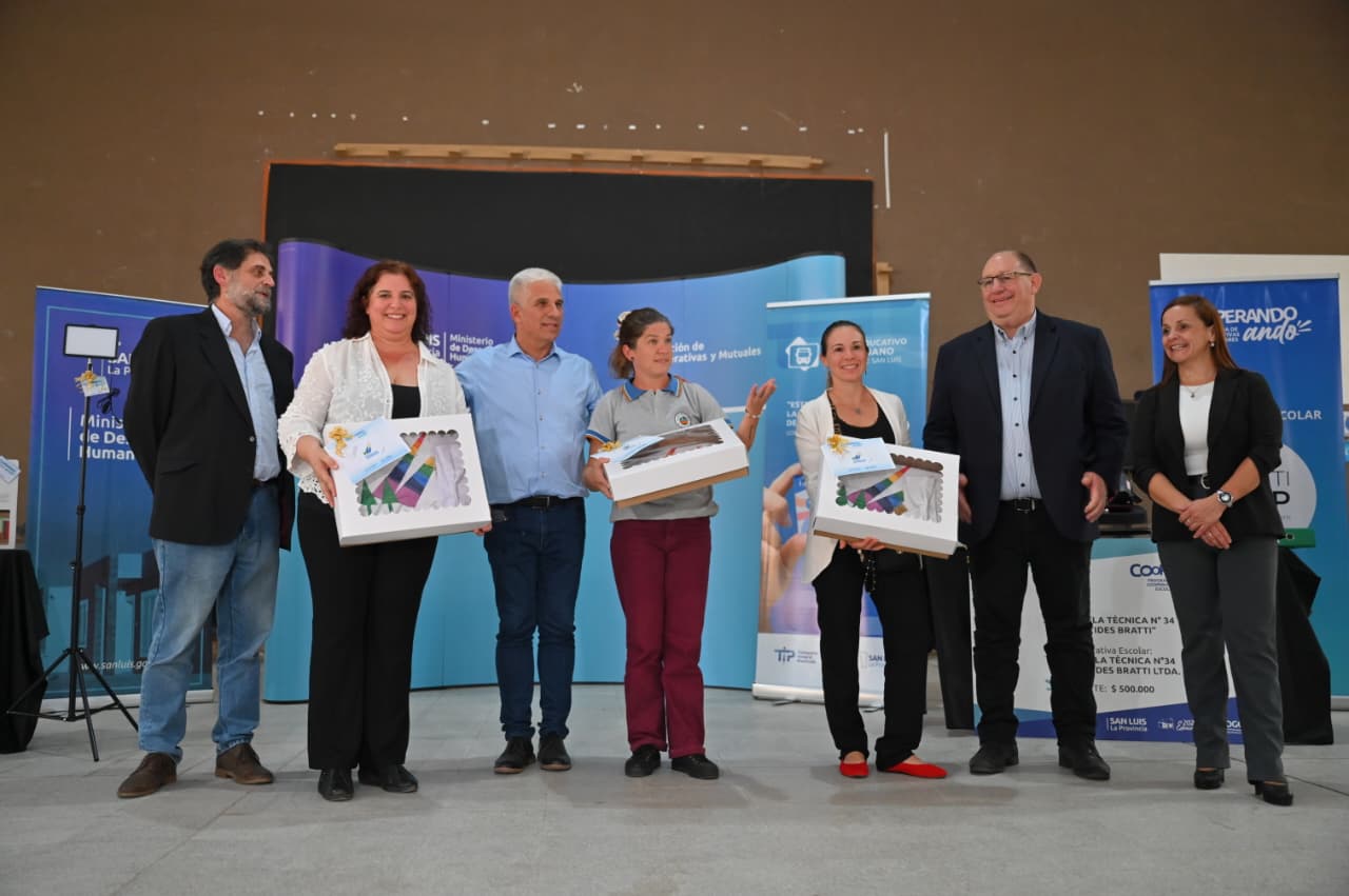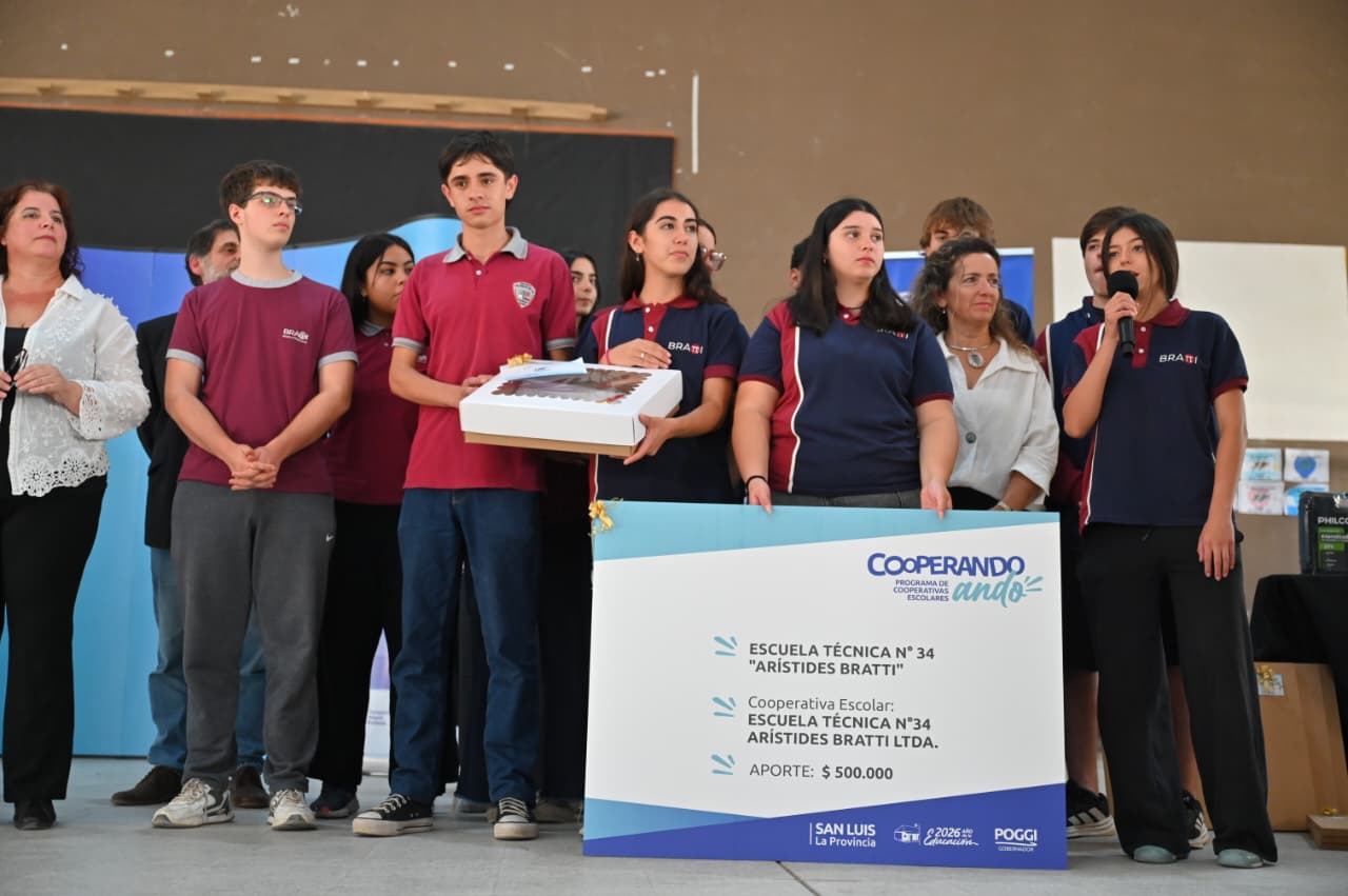 En la Escuela Técnica N°34 ‘Arístides Bratti’ de la Villa de Merlo, el gobernador Claudio Poggi participó de la entrega de insumos a cooperativas escolares de Merlo y Cortaderas, como parte del programa ‘Cooperando Ando’, una iniciativa que impulsa el cooperativismo en el ámbito educativo.