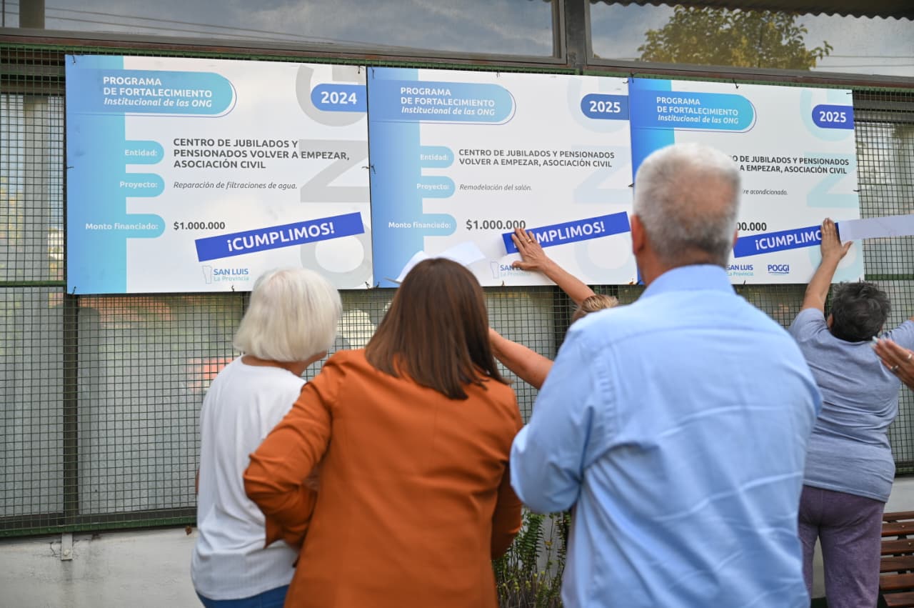 En el Centro de Jubilados y Pensionados ‘Volver a Empezar’ de la Villa de Merlo, el gobernador Claudio Poggi encabezó la entrega de los primeros decretos de financiamiento del año a 17 organizaciones no gubernamentales de los departamentos Junín y Chacabuco, en el contexto del Programa de Fortalecimiento Institucional de las ONG. Las entidades beneficiadas pertenecen a Merlo, Tilisarao, San Miguel, Carpintería, Balde de Escudero y Naschel, y destinarán los fondos a distintos proyectos sociales, educativos, deportivos y culturales.
