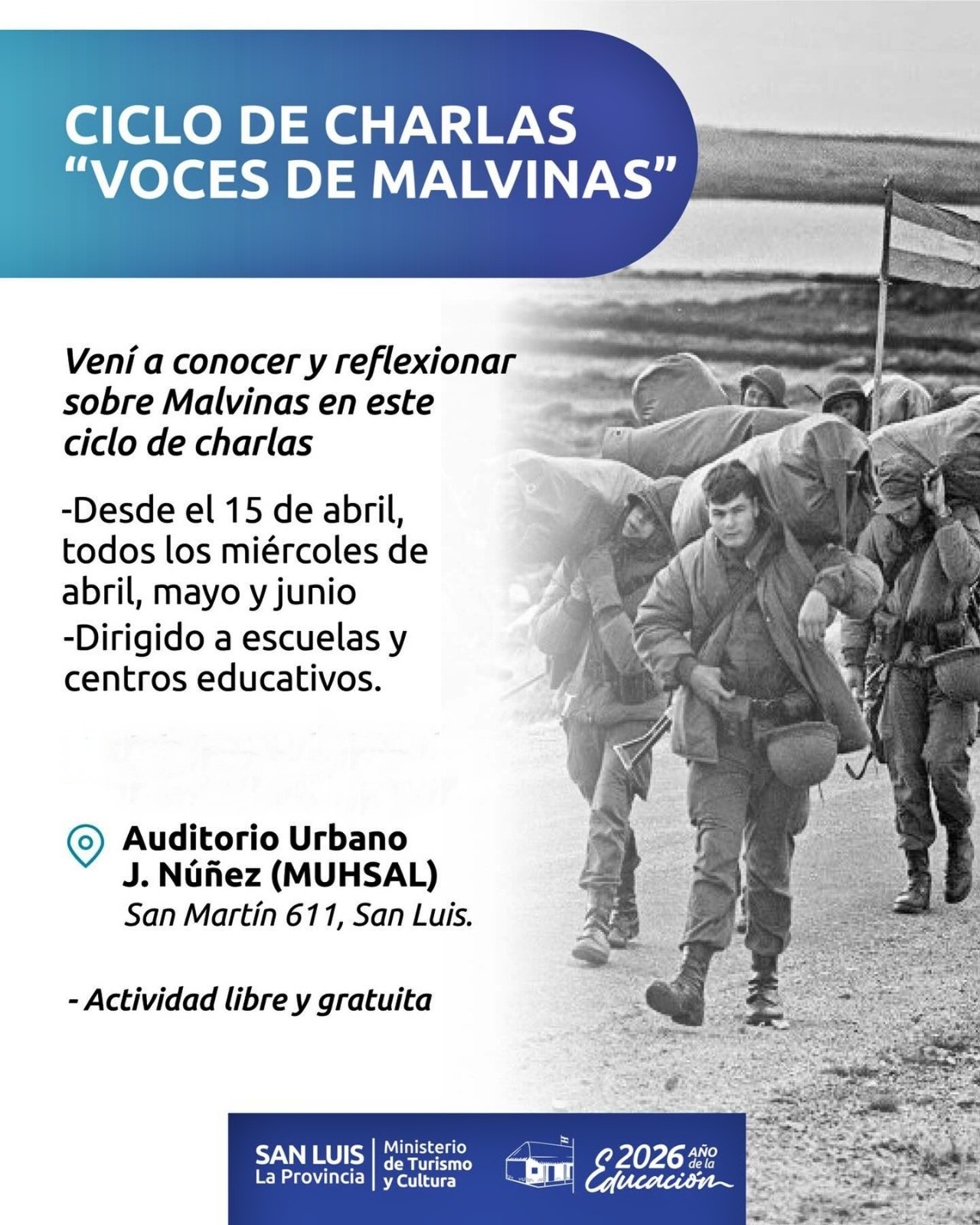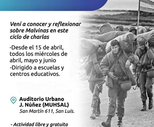 El ciclo de charlas ‘Voces de Malvinas’ que se brindan en el auditorio Urbano J. Núñez del Museo de Historia de San Luis (Muhsal), se extenderá por tres meses, lo que duró el conflicto en el Atlántico sur. Está destinado a jóvenes del nivel Secundario, tratando diferentes temáticas, como el uso del vocabulario de los excombatientes.