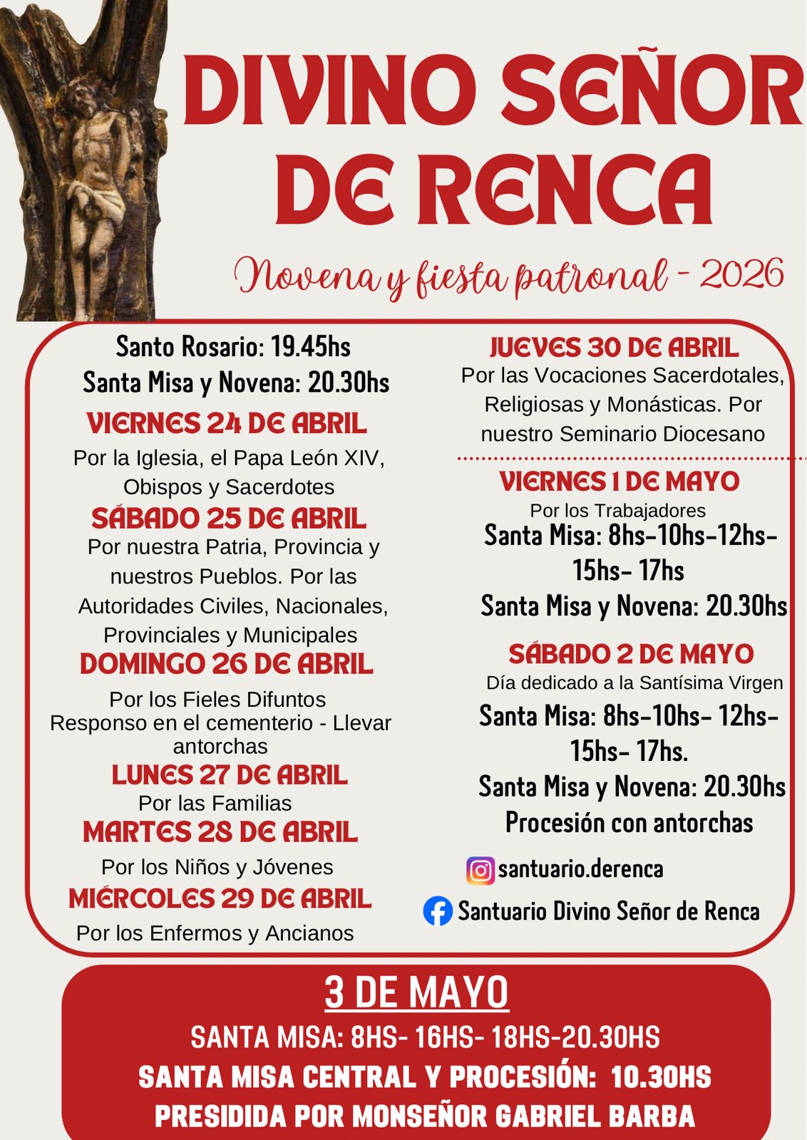 La localidad de Renca ya está lista para disfrutar de las celebraciones, en honor al Cristo, que comenzarán este viernes y se extenderán hasta el día de la fiesta patronal, el 3 de mayo. Cada jornada incluye el rezo del Santo Rosario a las 19:45 y la Santa Misa junto a la novena a las 20:30, con distintas intenciones que abarcan a toda la comunidad: la Iglesia, las autoridades, las familias, los niños y jóvenes, los enfermos, los trabajadores y las vocaciones religiosas.
