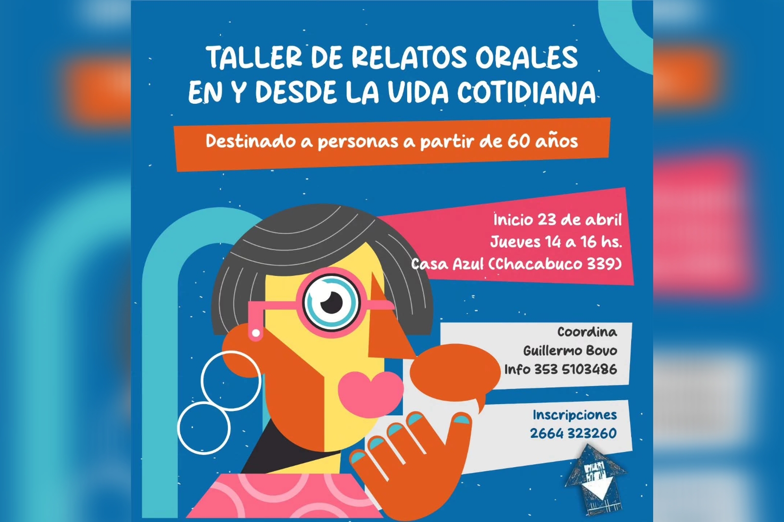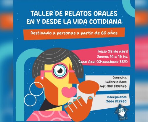 Este jueves 23, el centro cultural independiente ‘Casa Azul’, ubicado en calle Chacabuco 339 de la ciudad de San Luis, iniciará el ‘Taller de relatos orales en y desde la vida cotidiana’. La propuesta fue diseñada para la conversación y la construcción de narraciones e historias propias y colectivas. Las clases semanales serán todos los jueves, desde las 14:00 hasta las 16:00. Todavía hay cupos disponibles.